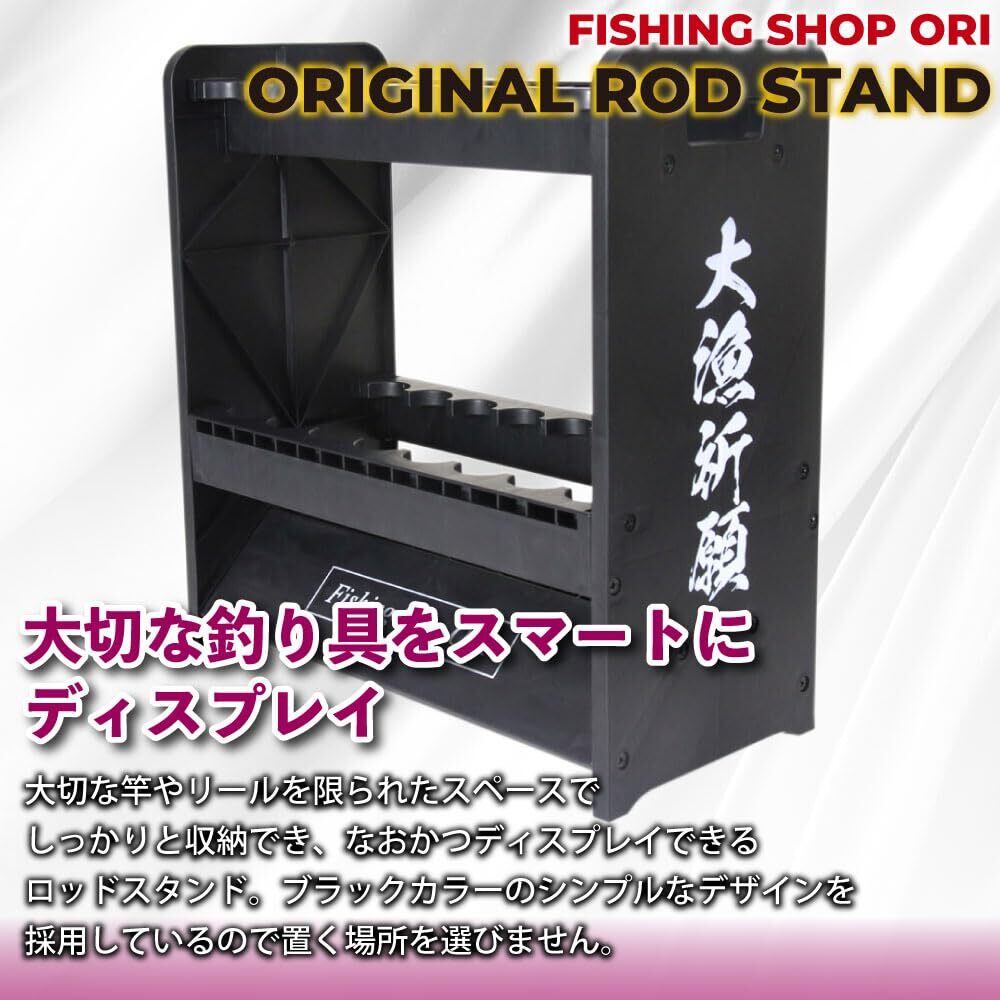 大切な竿やリールを限られたスペースでしっかりと収納でき、なおかつディスプレイできるロッドスタンド ブラックカラーを基調としているので置く場所を選びません また、側面にはキャッチフレーズやイラストをプリント。釣り人の遊びゴコロをくすぐるデザインとなっています 片面8本立て、計16本の竿を収納でき、スペース的にも余裕のある設計となっているので太めの竿もセットすることが可能 さらに、樹脂製で軽量に仕上げているので移動させるときも非常に便利、さらにドライバー1本で簡単に組み立てることができます