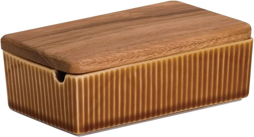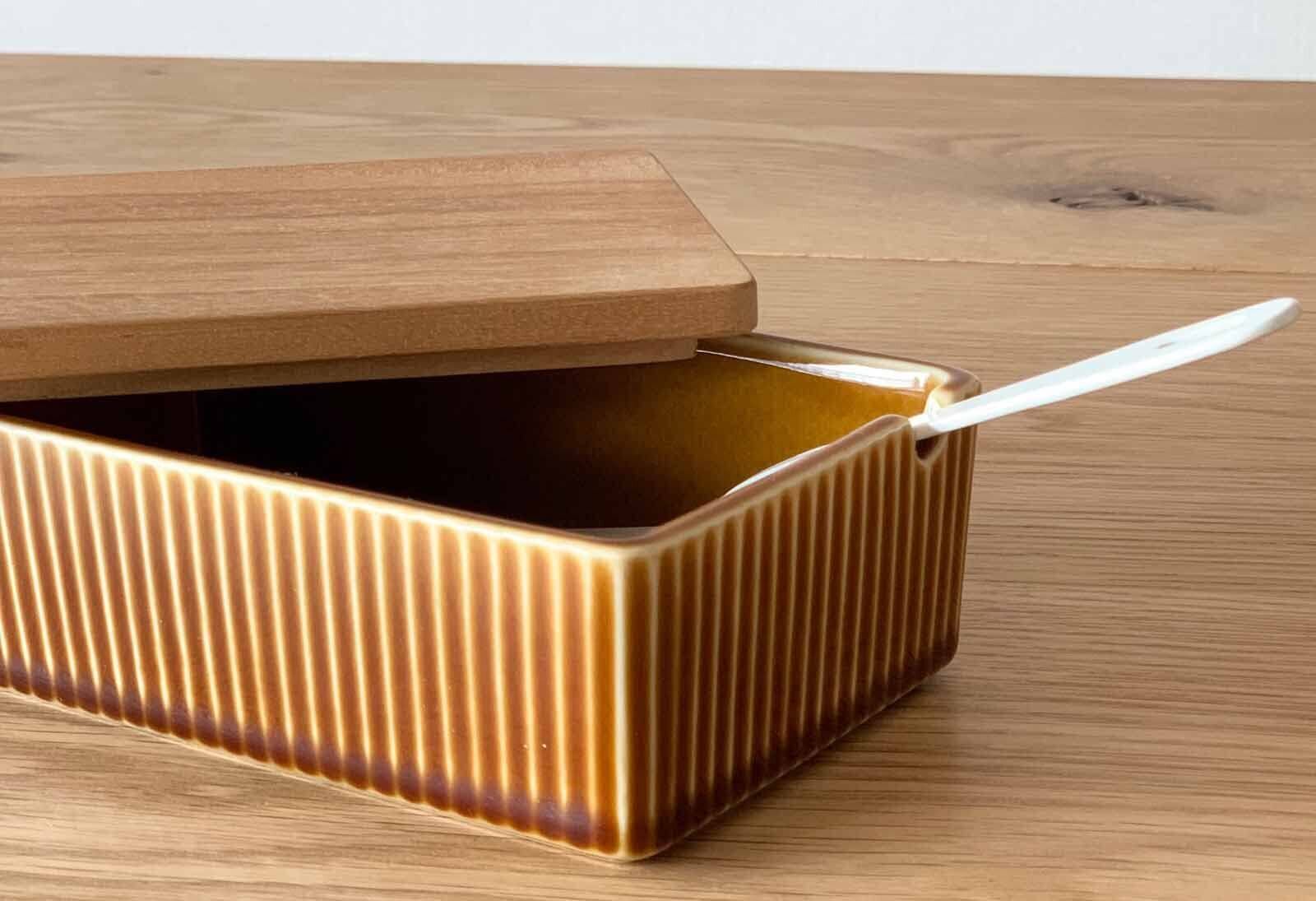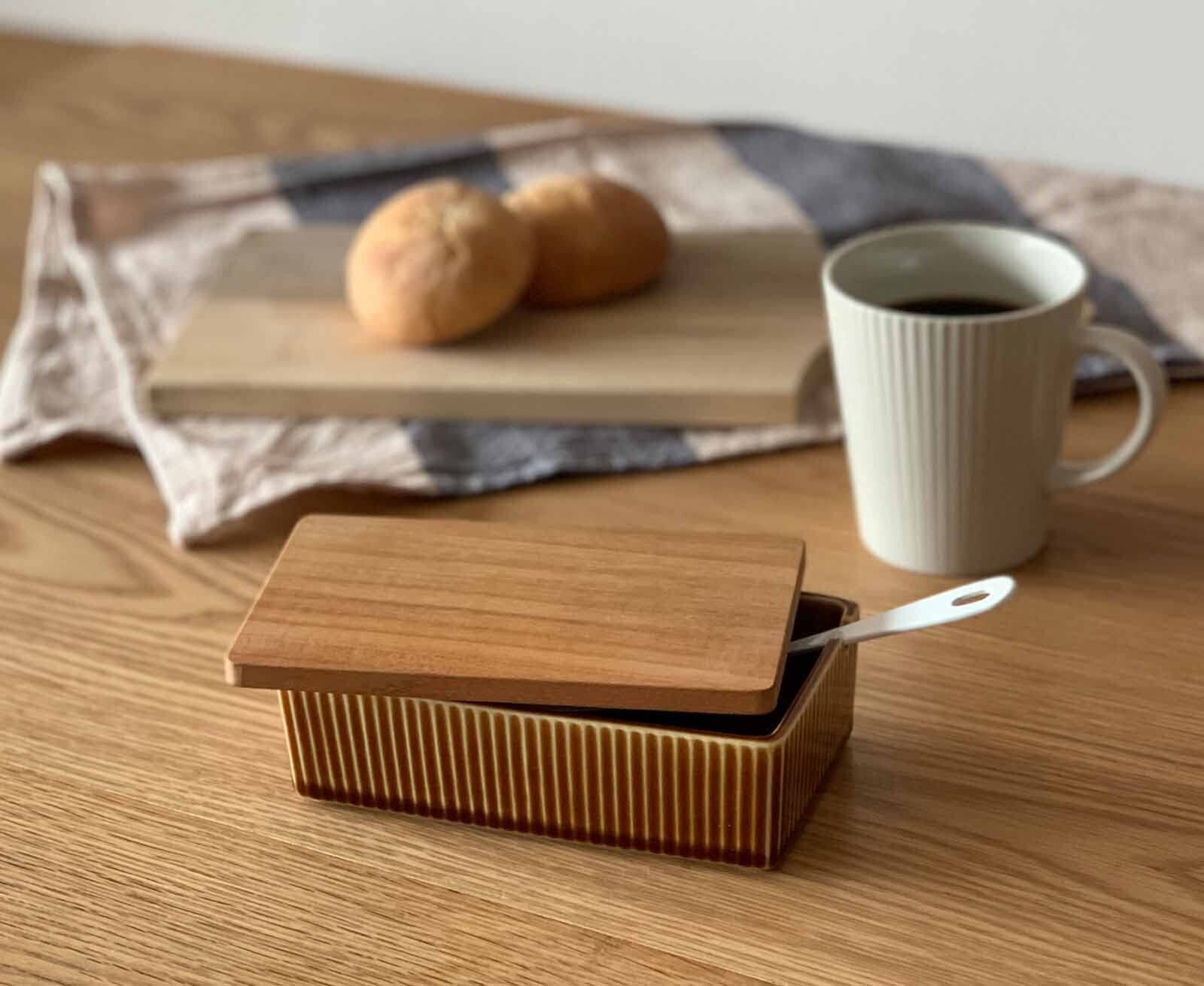 ●天然木の蓋としのぎ模様の陶器の組み合わせが可愛らしいバターケース