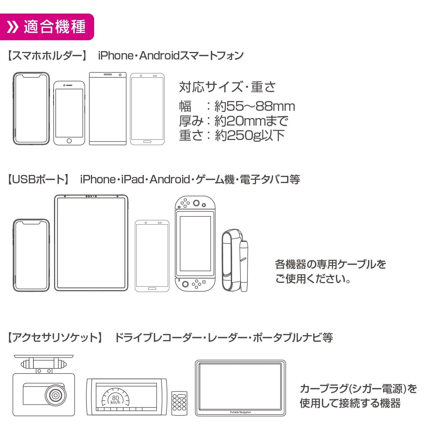 【対応スマホサイズ】幅:約55~88mm/厚み:約20mmまで/ホルダー部耐荷重:約250g以下【セット内容】ホルダー本体×1/アクセサリソケット取付ユニット×1/回転防止リング×1/コードクリップ×2/取扱説明書