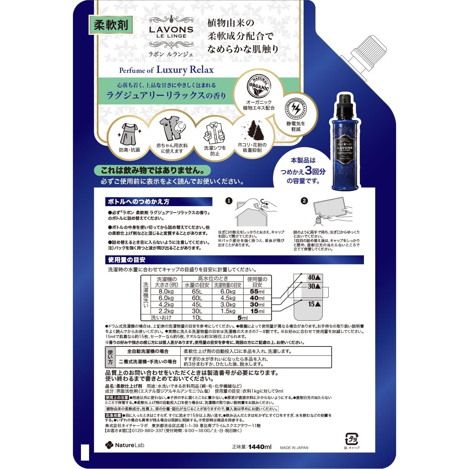 【在庫セール】ラボン(Lavons) 柔軟剤 特大 ラグジュアリーリラックス [アンバーウッディ] 詰め替え 3倍サイズ 1440ml