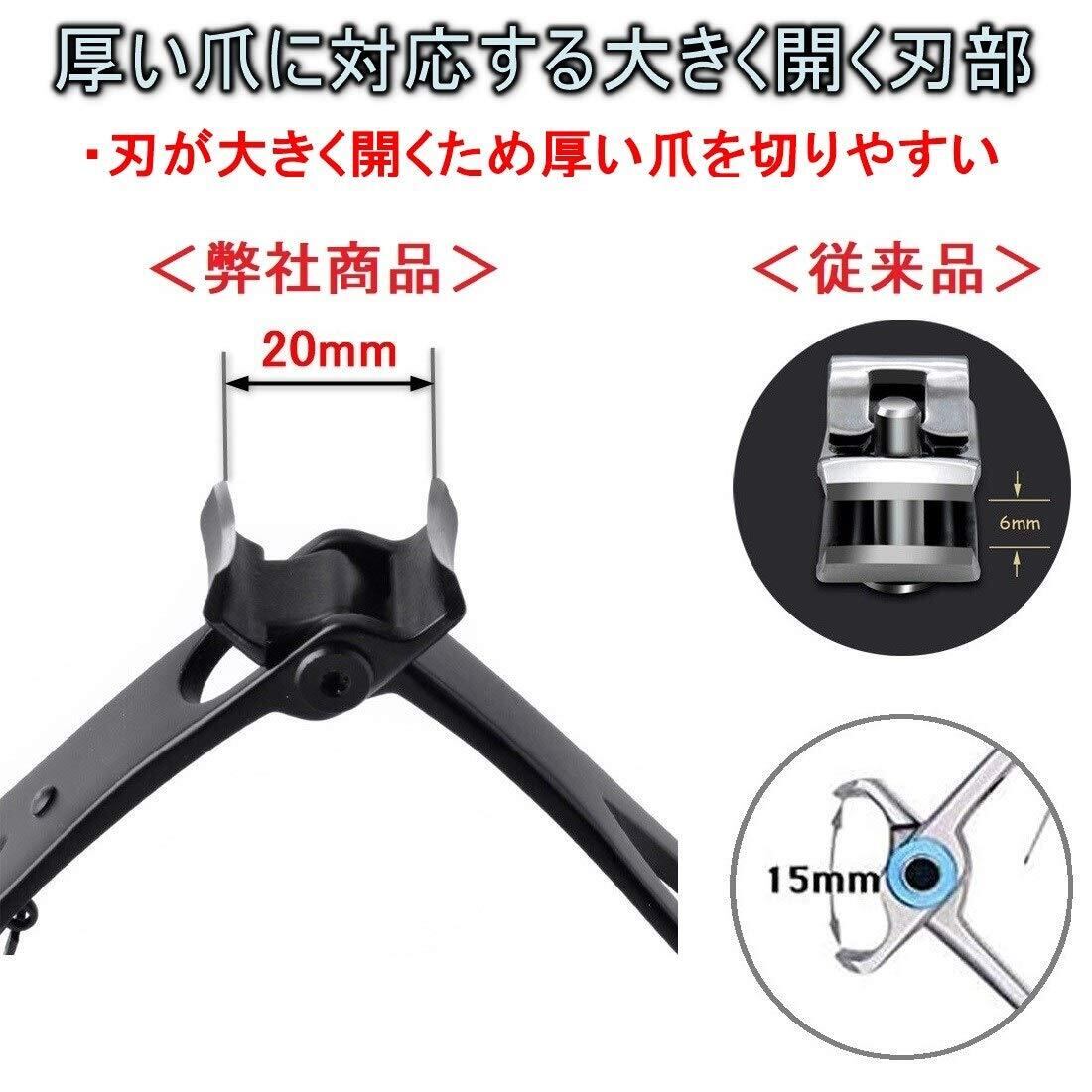 足の指などの厚い爪を切るのに適した大型爪切りです。 刃部分が大きく開くので、厚い爪も楽にカットできる構造の爪切りバサミです。