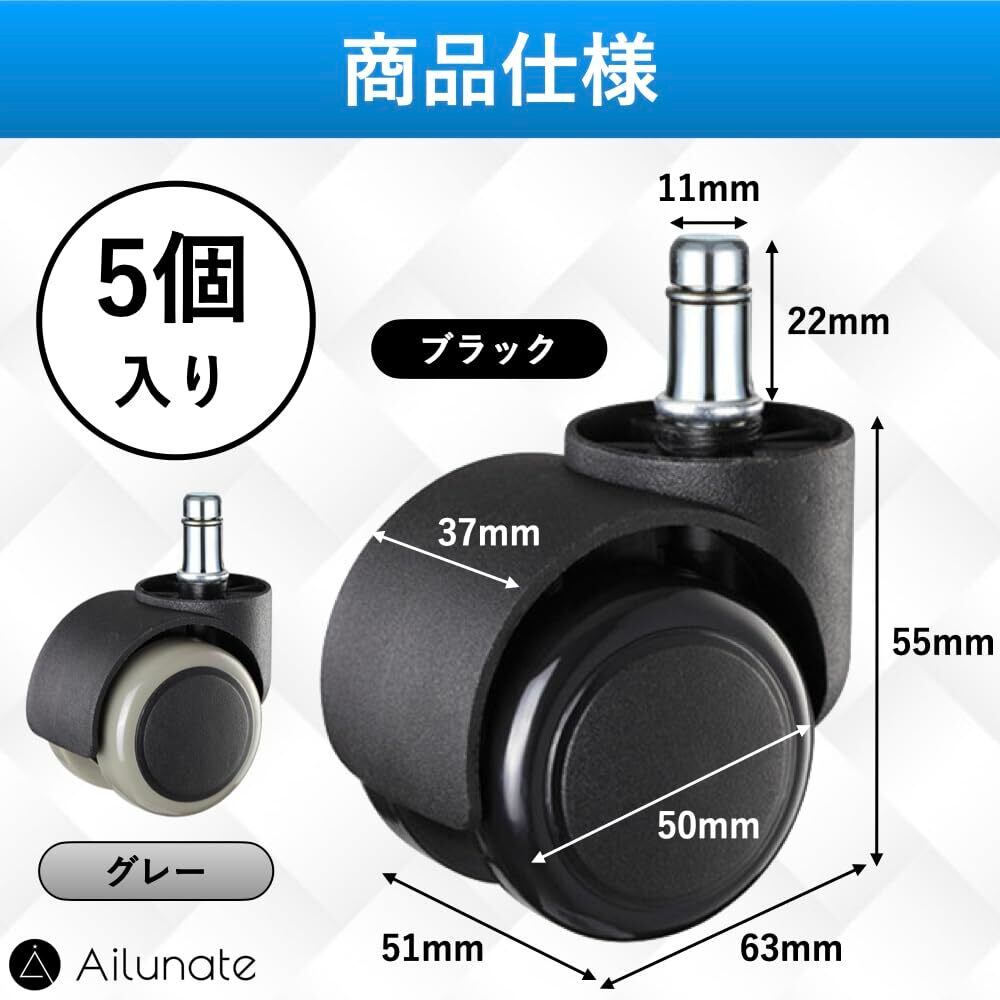 【新着商品】Ailunate キャスター 交換 椅子 ウレタン ゲーミングチェア オフィスチェア ホイール 車輪 傷防止 後付け 静音 保護 差込式 5点 (グレー)
