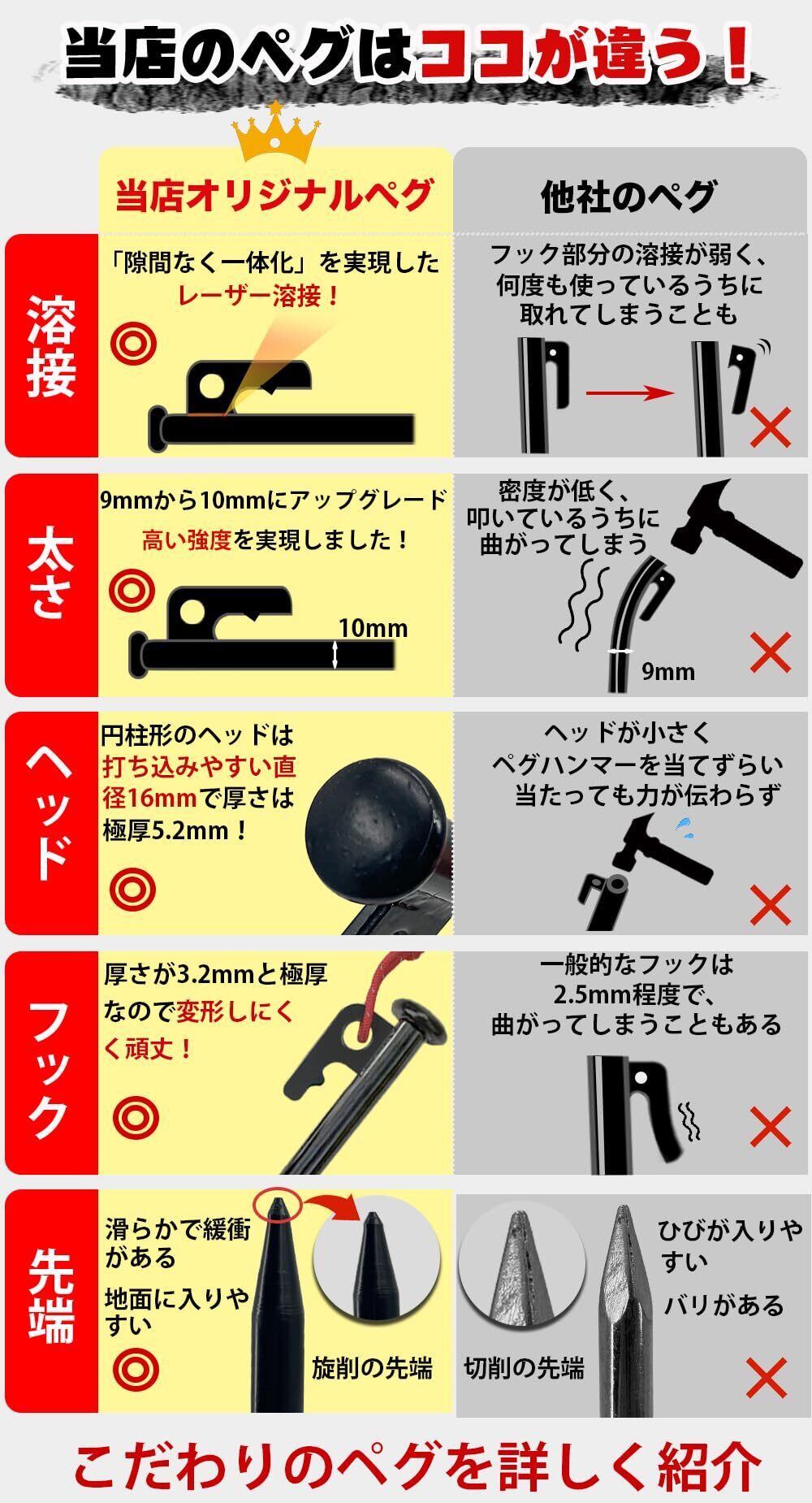 ◆直径約10mmの丸鋼で作られて、砂利や石が混じった固い地面でも深く、強く、しかも曲がらずに打ち込める頑丈さがあるペグです。