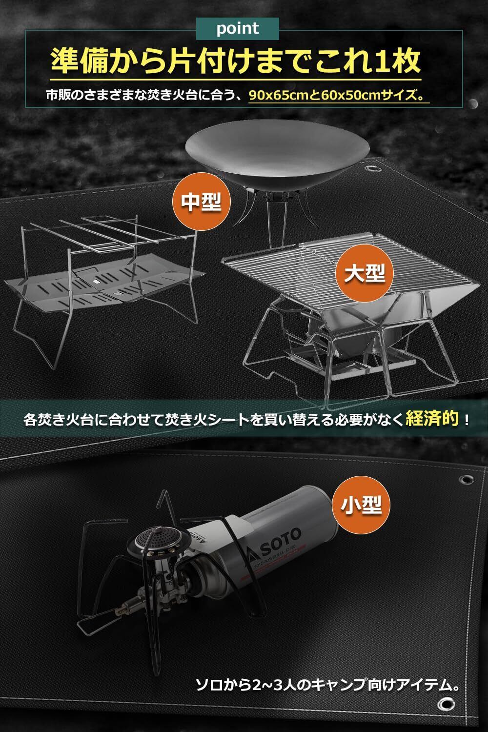??【使用場合】?最近発売されている小さい焚き火台、軽量焚き火台、その他もろもろ、地面へのダメージをあんまり考慮していないようなものを使っている人は、ぜひこのシートを買って欲しいと思いました。バイクのシートバッグのマフラー焼け防止にも適用です。商標登録番号:第6307890号