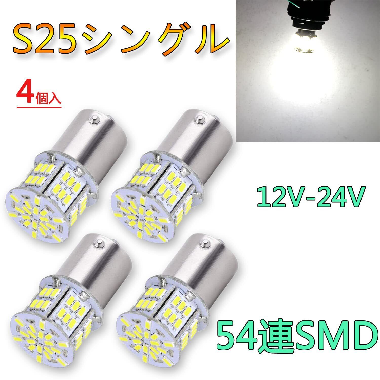 TORIBIO 4個入り 高輝度 S25 シングル球 LED(P21W 1156 S25 G18 BA15S)ピン角180度 長寿命 バックランプ 3014SMD 54連 6000K 12V 24V兼用 (ホワイト)