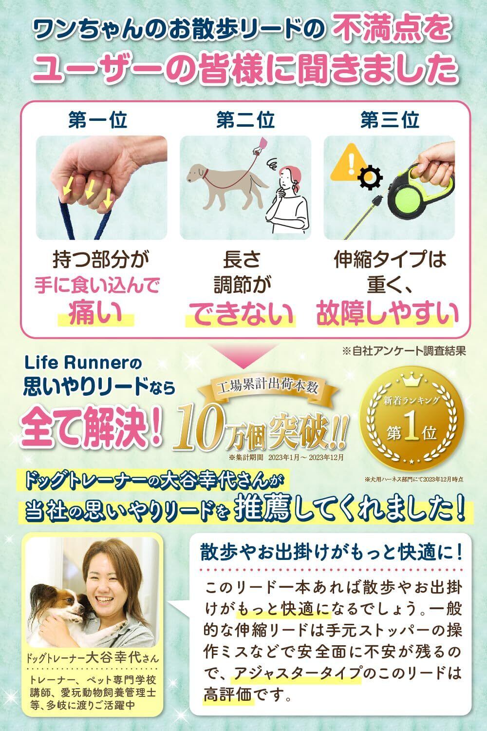 【ドッグトレーナー推薦】ユーザーの皆様の声に耳を傾け、従来の犬用リードに抱いている不満点を改善しました。ドッグトレーナーさんからも推薦の言葉をいただきました。
