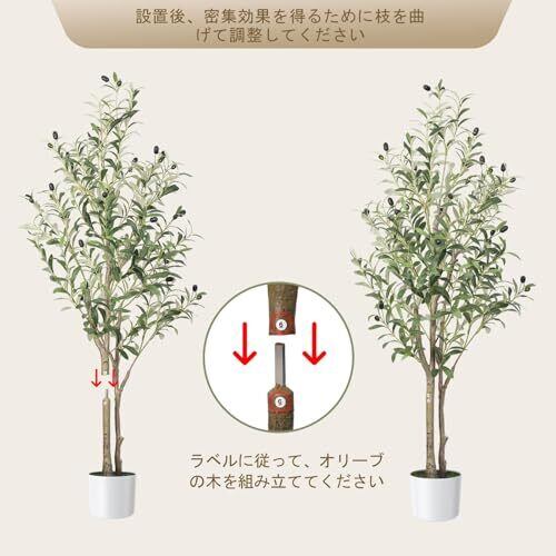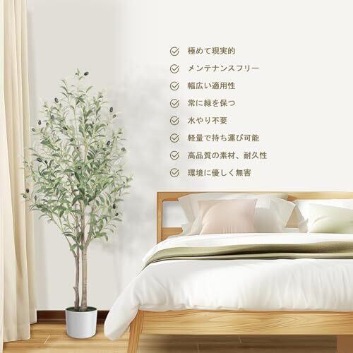【仕様】このオリーブの木の高さは120CM、重さは4KGです。二つの幹があります。自然にフレッシュで本物にとても近い色に見えます。場所によって真正性を見分けがつかないほど枝葉と実が特徴で、近くで見ると細部までリアルに再現されています。環境にやさしく、日当たりのナチュラルな雰囲気を作り出しています。