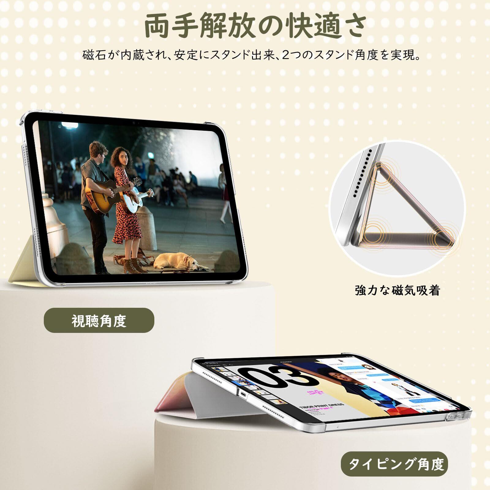 「三つ折りスタンド設計」 三つ折りのフロントカバーには、複数のマグネットが均等に内蔵されています。iPadを立てて使用する際にしっかりサポートし、安定した角度を維持したまま快適にお使いいただけます。