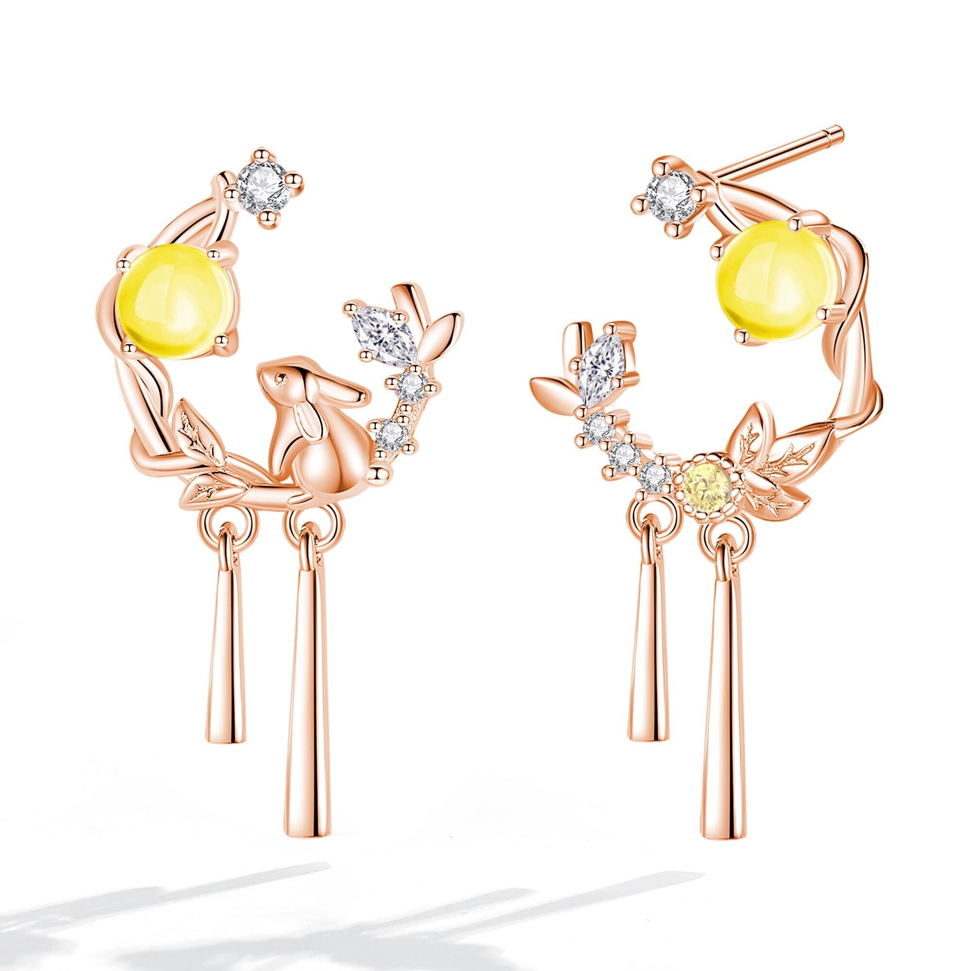 【月とうさぎのデザイン】月とウサギはいつも特別な組み合わせです。玉兎は、愛らしさ、活発さ、遊び心など、丸くて柔らかいイメージです。この愛らしいウサギが、あなたの人生に活力と新しい期待をもたらしてくれることでしょう。女性らしさと華やかさを演出します。年齢を問わず付けて楽しいピアスレディース。