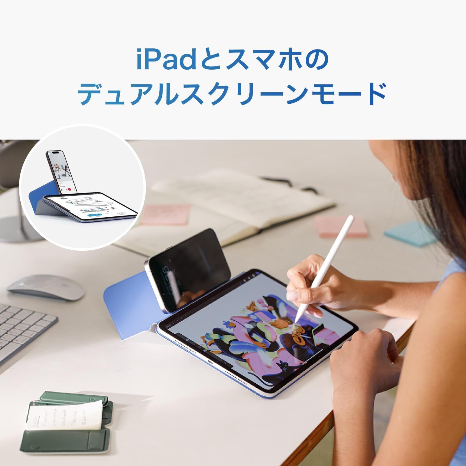 【iPadとスマホを同時に使えるデュアルスタンド機能】横置きモードでは上部にスマホを固定できる機能を搭載。iPadとスマホの同時使用で、スマホを見ながらのイラスト作成やノート作成に最適。