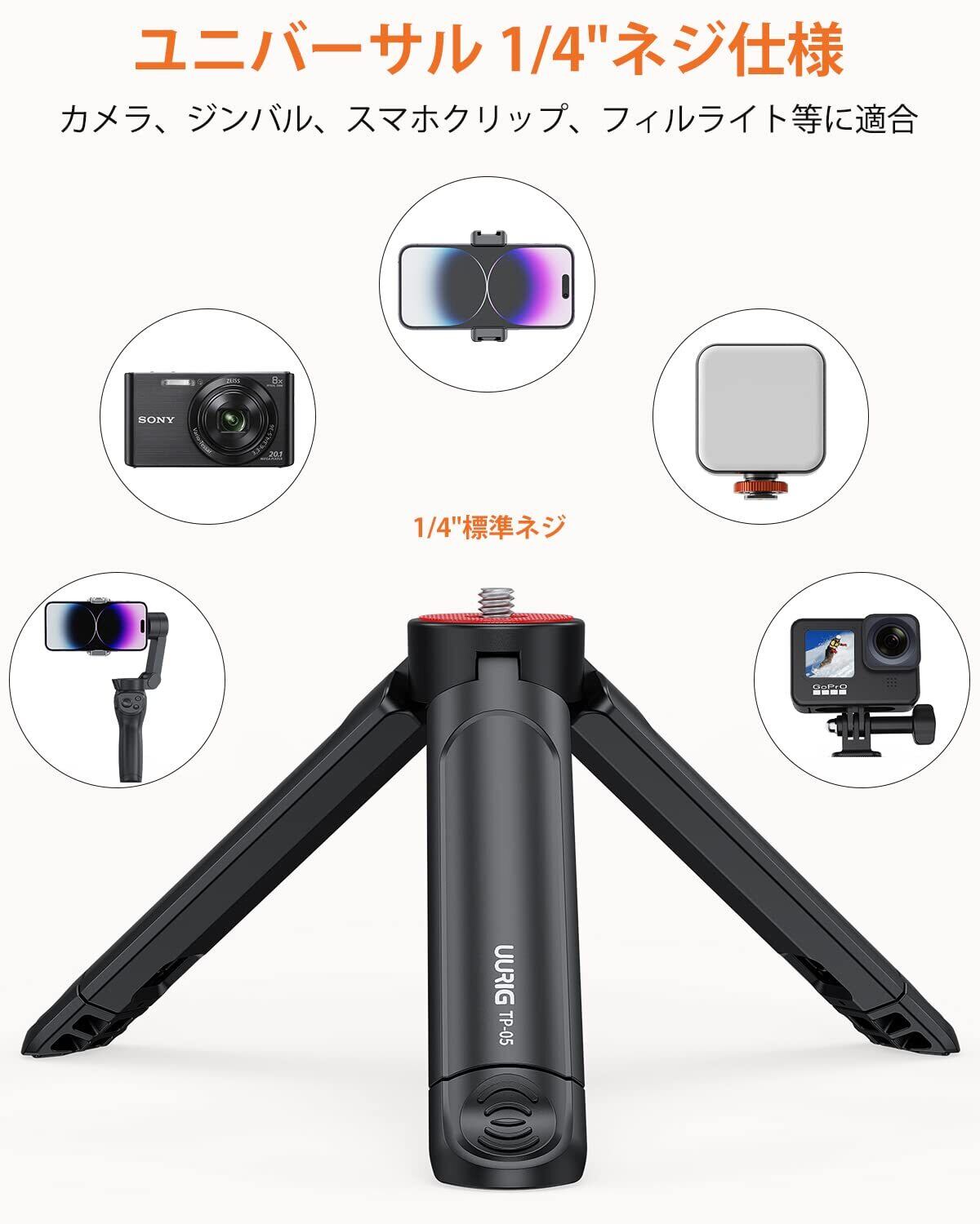 【在庫処分】UURIG ミニ三脚 卓上 カメラ 三脚 カメラスタンド 1/4インチネジ スマホ ジンバル スタンド 小型 軽量 伸縮可能 折りたたみ コンパクト 持ち運びに便利 マイクロ三脚 シンプル 耐荷重2kg ブラック
