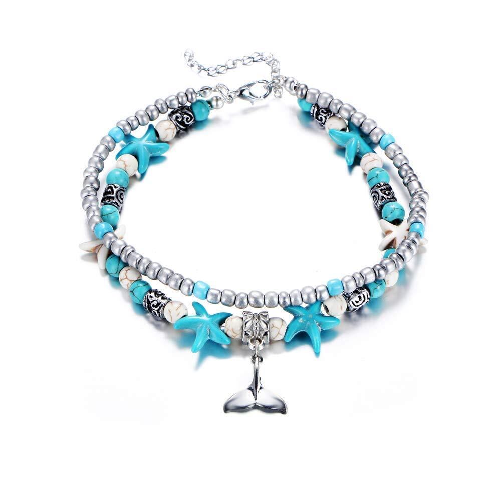 Lucbuyボヘミアン足首、足首のブレスレット、青と白の多層グラマービーチ砂手作りアンクレット足女性らしい女の子の贈り物、デート/パーティー/卒業/ショッピング/ビーチに適して