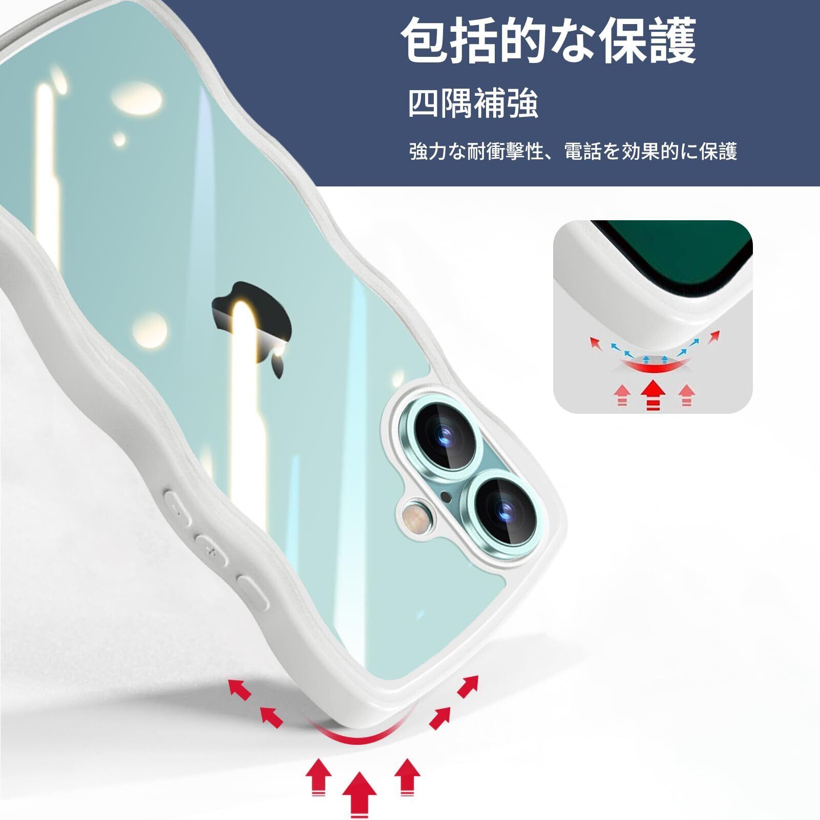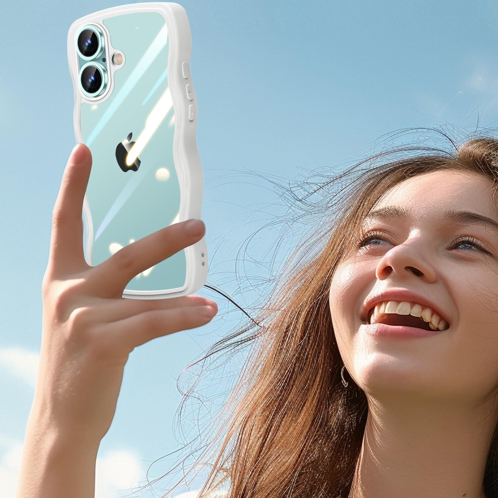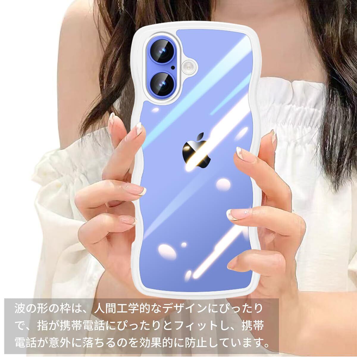 iPhone 16 用 ケース クリア 波状フレーム 耐衝撃 アイフォン 16 用 スマホケース かわいい 人気 可愛い 女性用 カバー 滑り止め ワイヤレス充電対応 ストラップホール付き ストラップ1種付き (ホワイト)