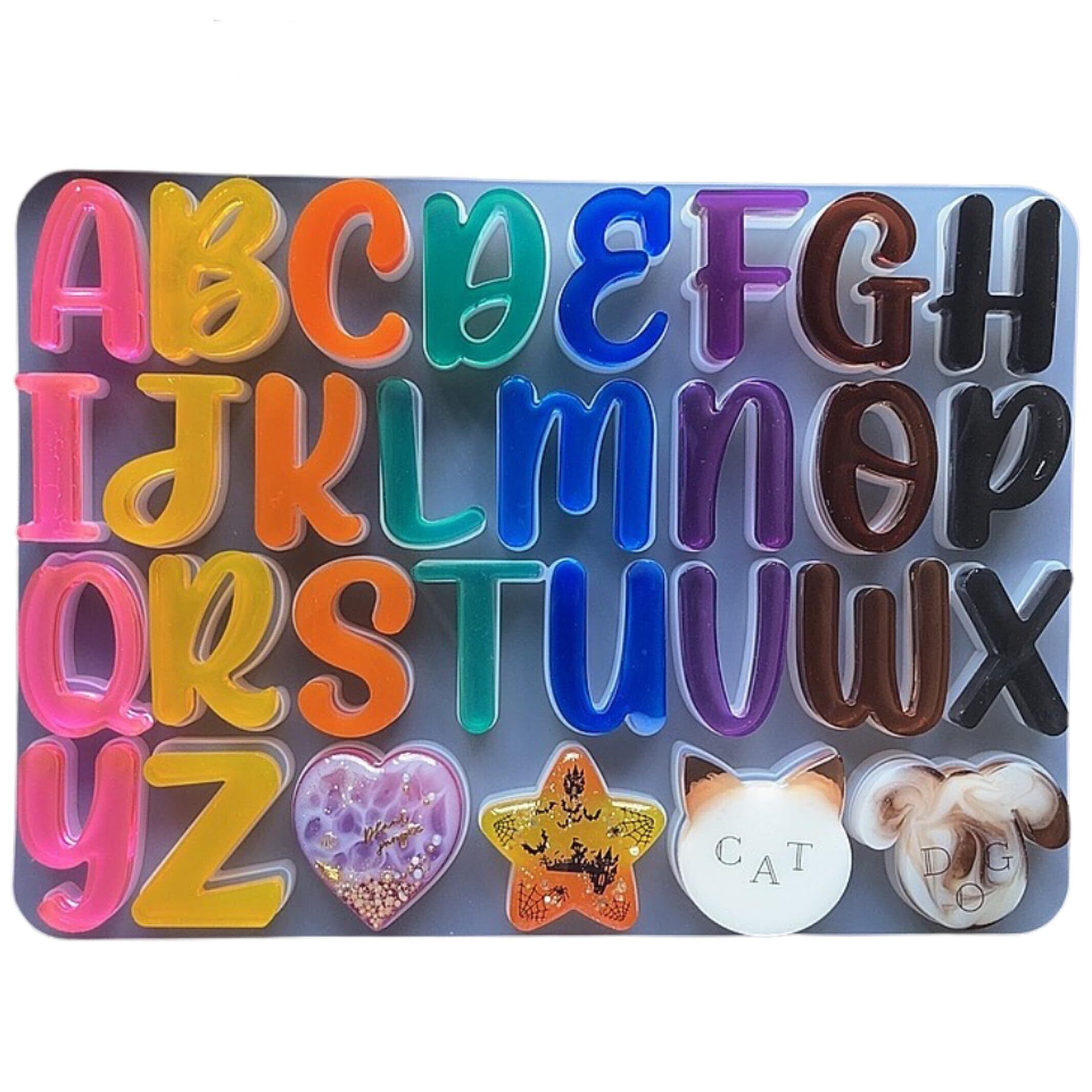 ?【商品について】手書き風なデザインがかわいいアルファベットとイヌやネコ、 星、ハートの形が作れるシリコンモールドです。一体型となっているシリコンモールドです。一枚なので収納場所をとらず便利です。UVレジン、ほしエポキシ樹脂、樹脂粘土などにご利用いただけます。