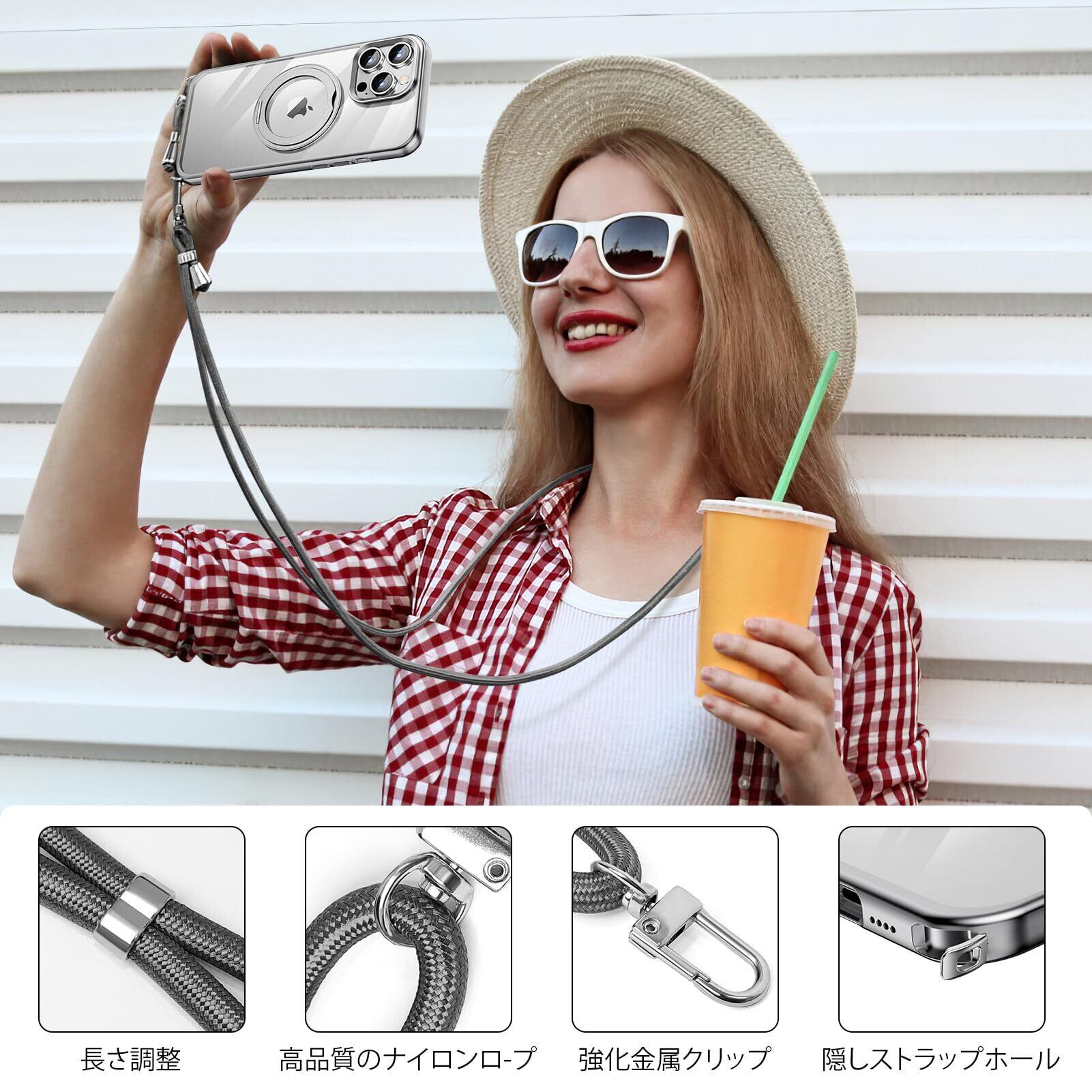iPhone 14 Pro 用 ケース ダブルリング付き ショルダー ストラップ付き 多機能360度回転スタンド MagSafe対応 ワイヤレス充電対応 耐衝撃 薄型 透明 PC + 軽量 シリコン TPUバンパー おしゃれ スマホケース (グレー, iPhone 14 Pro)