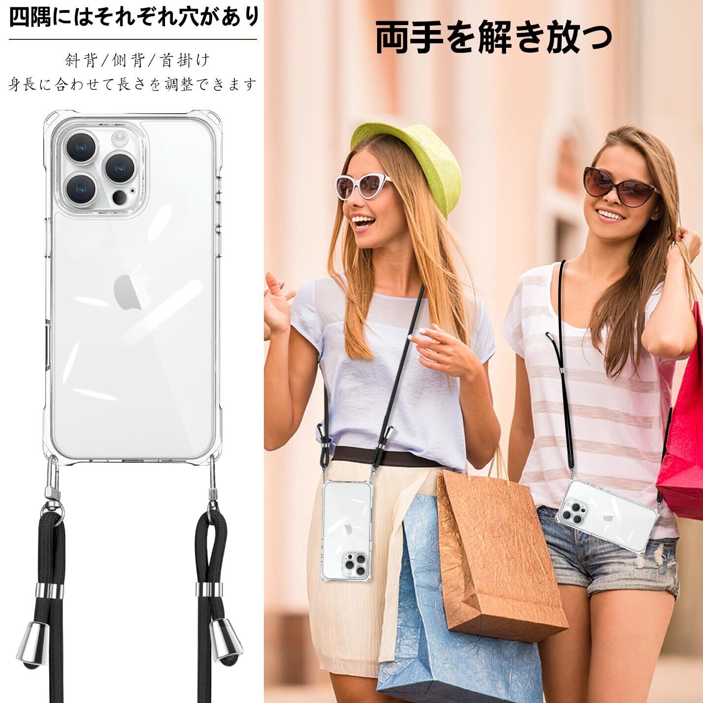 iPhone 16 Pro ケース ショルダー クリア アイフォン16Pro スマホケース 肩掛け 斜めかけ 縄掛けケース 透明 薄型 軽量 TPU 携帯ケース 紐付き 斜めがけ 織りストラップ付き 長さ調整可能 取り外し可能 落下防止 紛失防止 (ブラック)