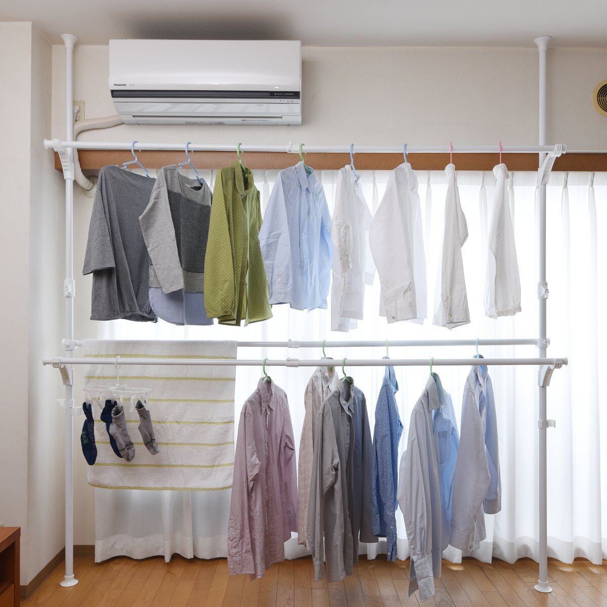 ●日当たりの良い窓際でも、エアコン下でも、壁面にも、設置場所を柔軟に決められる突っ張り固定式の室内物干し