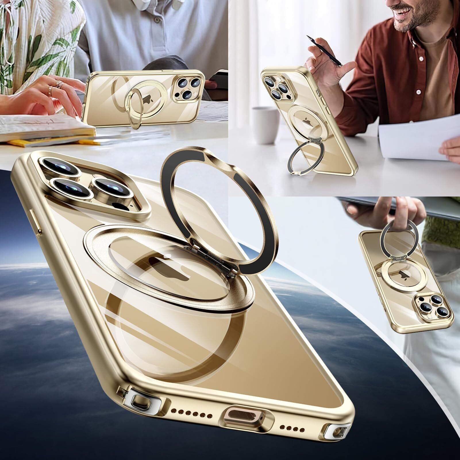 LUTSIDUTA iPhone 13Pro Max 用 ケース ダブルリング付き ショルダー ストラップ付き 多機能360度回転スタンド MagSafe対応 ワイヤレス充電対応 耐衝撃 薄型 透明 PC + 軽量 シリコン TPUバンパー おしゃれ スマホケース (ゴールド, iPhone 13 Pro Max)