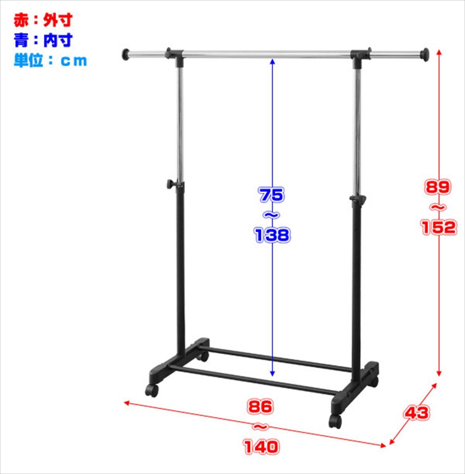 山善(YAMAZEN) 高さ伸縮パイプハンガーラック サイドバー付 シングル キャスター付き ブラック MKS-SS(BK)(S)