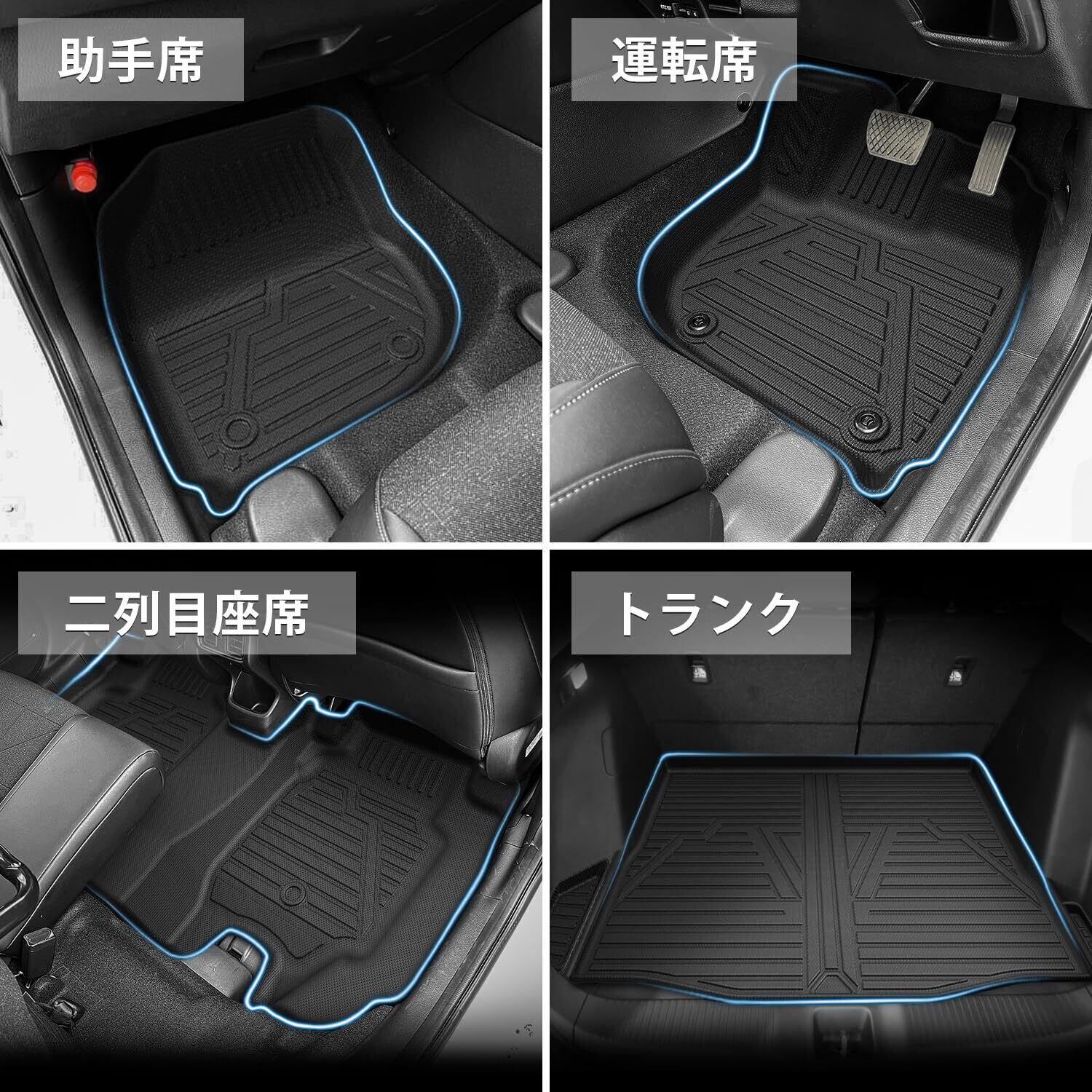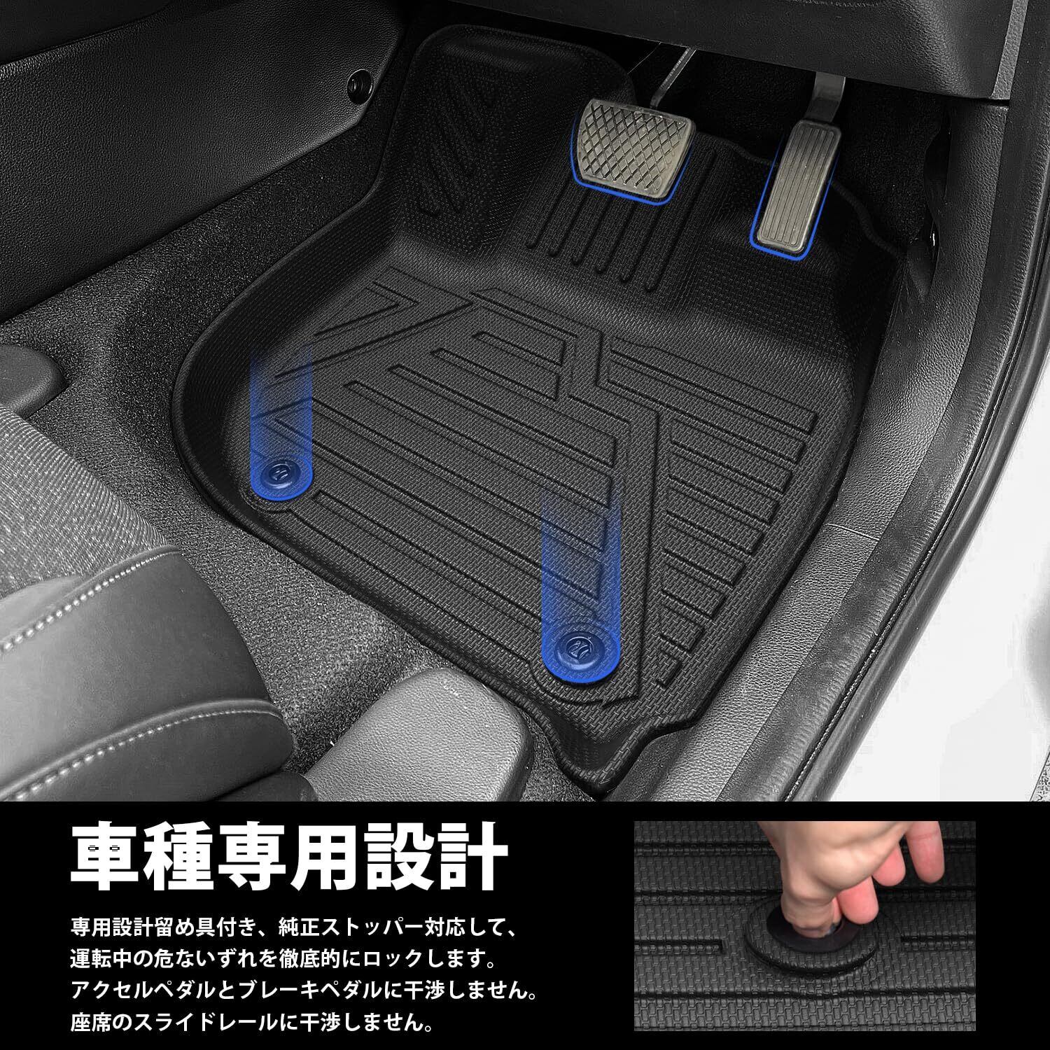 【車種専用設計でピッタリフィット】■車種専用設計、マットのズレ防止。運転席は純正ストッパーに対応するホール付きます。それに、助手席は留め具裏面にはマジックテープ付きます。■アクセルペダルとブレーキペダルに干渉しません。■座席のスライドレールに干渉しません。抜群フィッティングします。こだわり車種専用設計のため、車内に隙間なくフィットします。