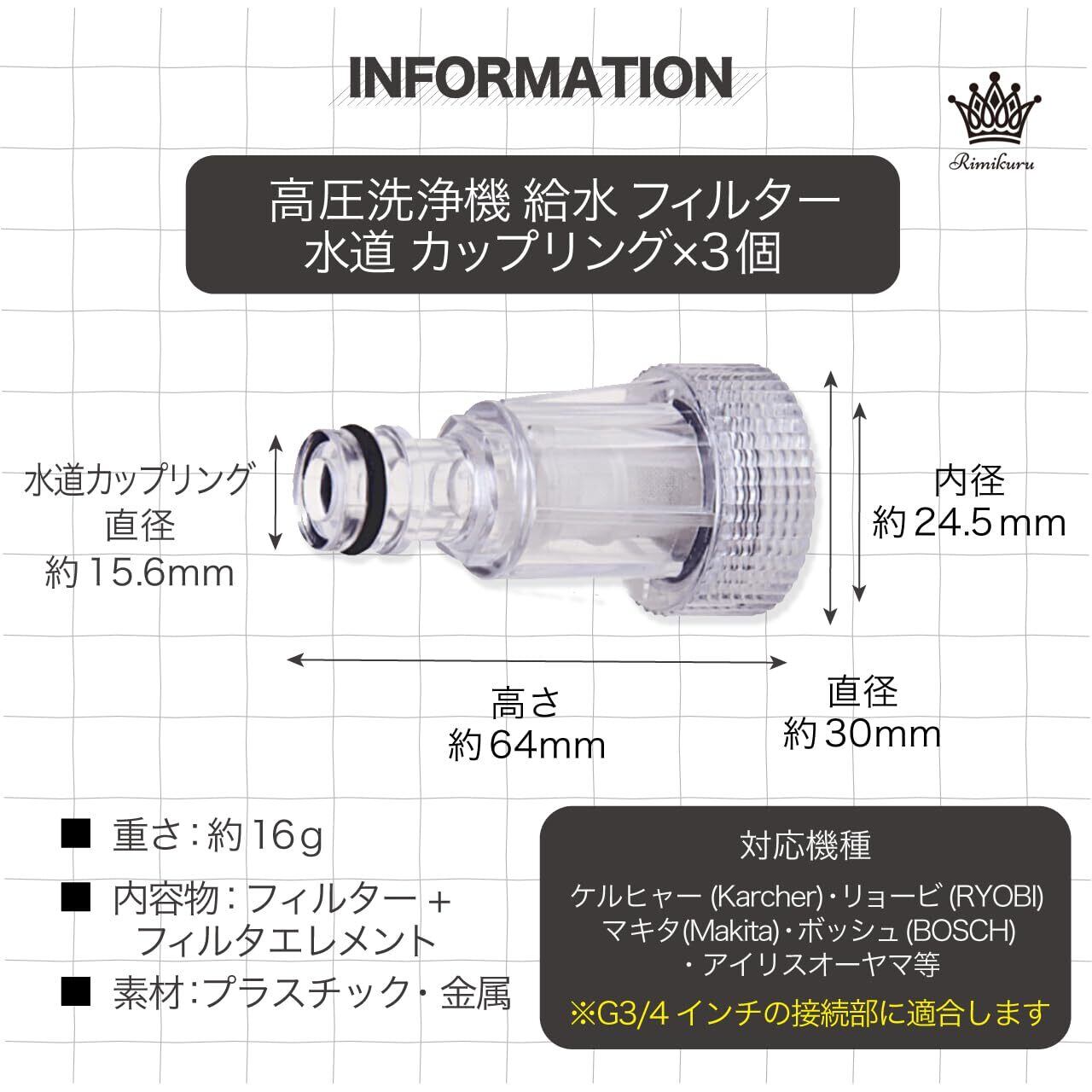 【商品仕様】セット内容:高圧洗浄機 給水 フィルター 水道 カップリング ×3個セット サイズ:高さ 約64㎜ / 直径 約30㎜ / 内径 約24.5㎜ / 水道カップリング直径 約15.6㎜ 重さ:約16g 内容物:フィルター + フィルタエレメント 対応機種:ケルヒャー(Karcher) , リョービ(RYOBI) , マキタ(Makita) , ボッシュ(BOSCH) , アイリスオーヤマ等※G3/4インチの接続部に適合します。接続部のサイズをご確認の上ご購入くださいませ。 素材:プラスチック, 金属 ※モニターの環境等により、色の見え方に若干差が生じる場合がございます。