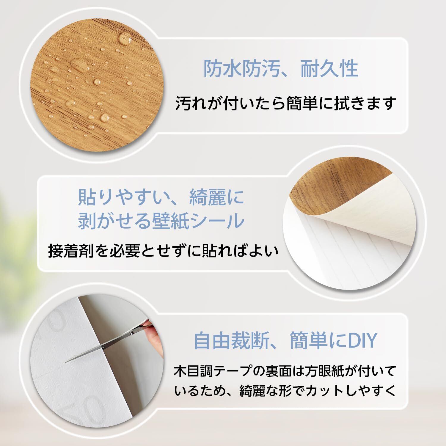 【貼りやすい剥がせる壁紙シール】木目調テープの裏面に粘着剤が付いており、そのまま貼り付けられる。貼ってはがせる木目シートですが、しわや破れなどになりにくいタイプで、キレイに貼れます。10cmの幅で、初心者一人でも簡単で仕上がります、賃貸でも安心にご利用いただけます。