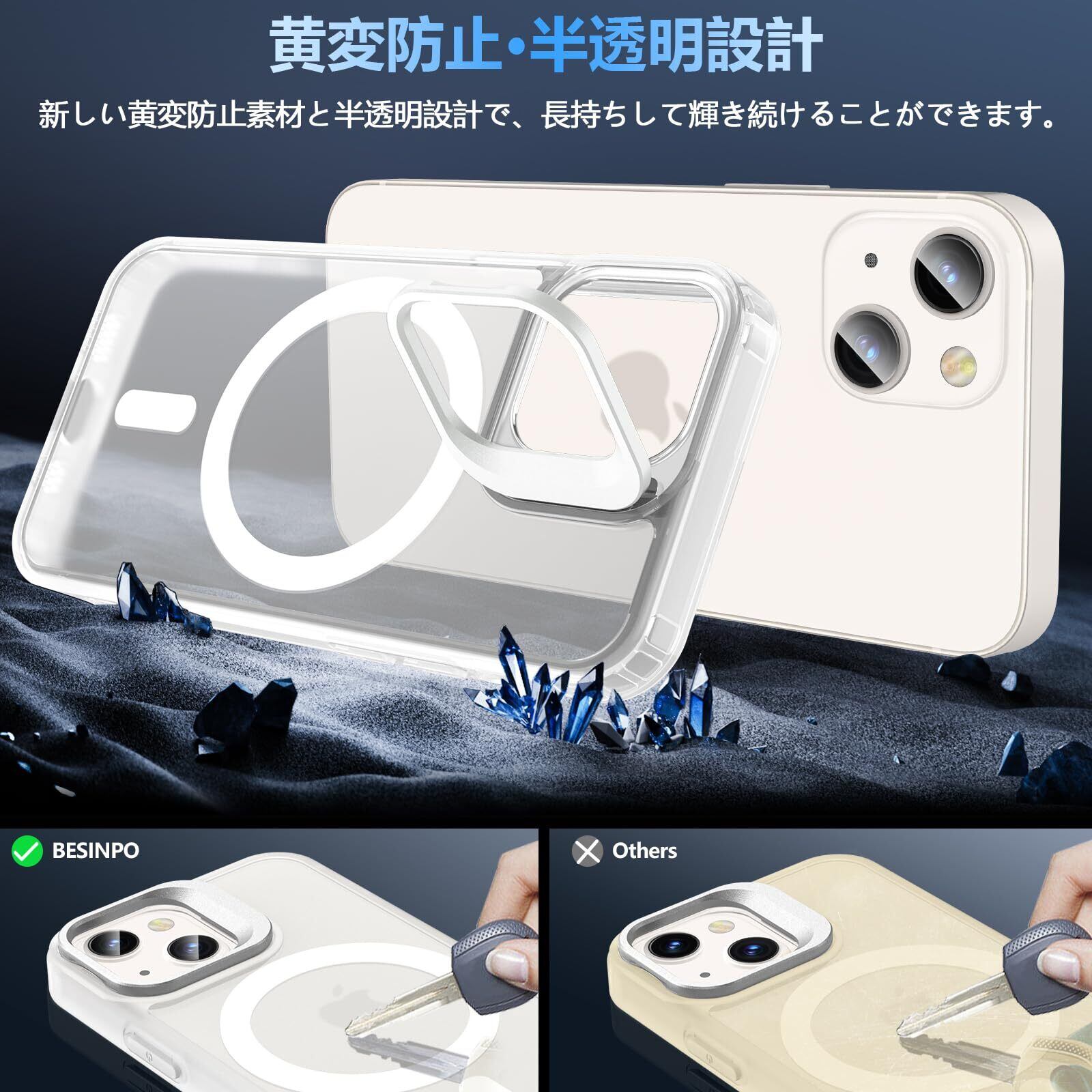 BESINPO iPhone15 ケース アイフォン15 ケース [ガラスフィルム付き・MagSafe対応・スタンド機能] 縦横両対応 調整可能 半透明 黄ばみなし 指紋防止 アイホン15ケース 米軍規格 耐衝撃 耐久性 マグネット搭載 マグセーフ対応 ストラップホール 隠しスタンド iPhone 15 ケース 6.1インチ対応 半クリア