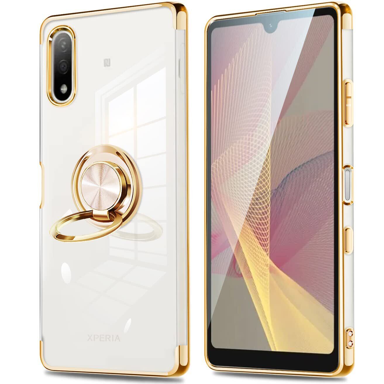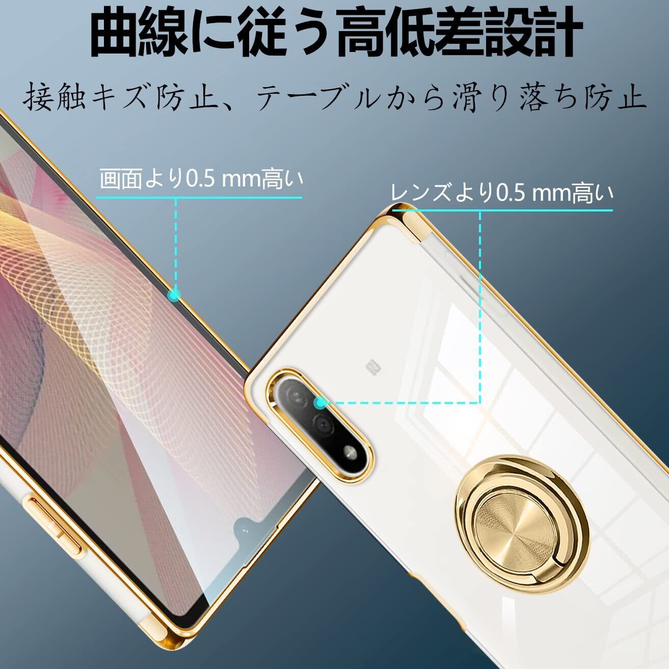 Xperia ACE II ケース リング付き クリア ace2 SO-41B カバー リング 耐衝撃 透明 スリム TPU 薄型 メッキ加工 ソフト シリコン スタンド機能付き 360回転 車載ホルダー対応 (ゴールド)