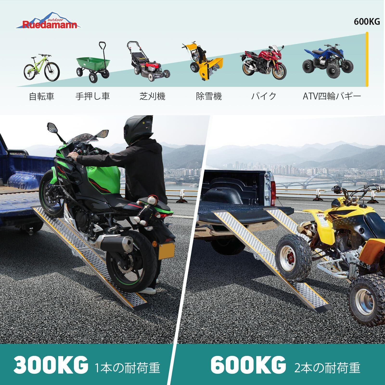幅広い対応:Ruedamannのバイクラダーレールは、単本使用時の耐荷重は300kgで、電動自転車やバイクなどの積載車へ積み込む際に使いやすいアルミスロープです。2本併用すると耐荷重は600kgとなり、ATV四輪バギー、草刈り機、薪割り機などの設備を小屋、納屋、ガレージへ積み込むためのアルミラダーレールです。
