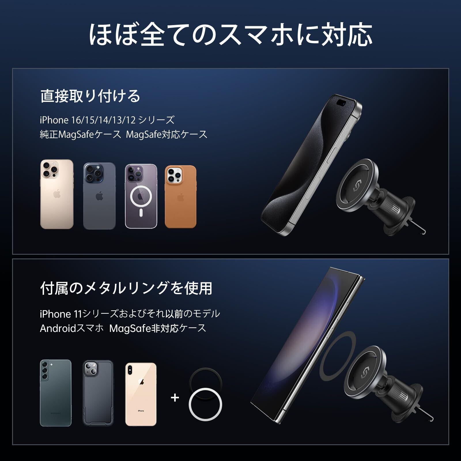 全種類スマホに対応: ※MagSafe対応機種のスマホ(iPhone 15/iPhone 14/iPhone13 全シリーズ)に直接、もしくはMagSafe搭載ケースの使用で本製品を使用できます。。※MagSafeが搭載されていないスマホの場合:ケースに付属のメタルリングもしくはSyncwireスマホマグネットリングを装着すれば、MagSafe非対応のiPhoneや他のスマホでも使用可能です。