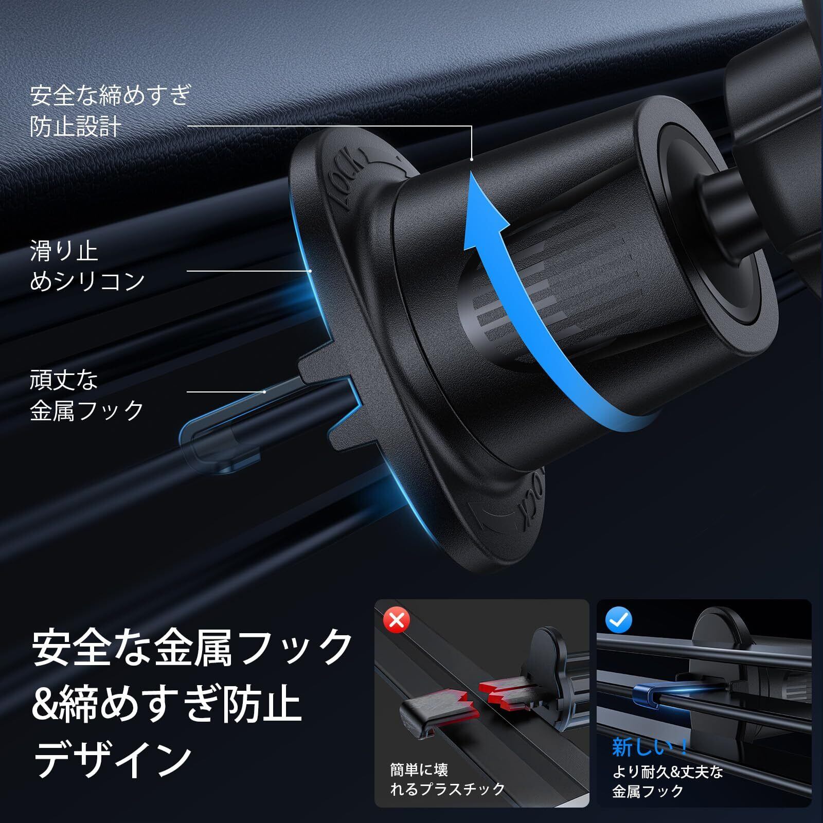 こだわりの安心設計:その他製品と比べると、フックは締め付け過ぎによってエアコン吹き出し口のブレードが壊れないよう、過締め付け防止機能が付いています。フック自体も金属製よりも強度が高く、締め付け時にフックが割れにくいのもポイントです。アクリル製の本体と金属製のフックでおしゃれでスタイリッシュなスマホホルダーです。フックの延長範囲は10mm?25mmです。風のブレードの厚さは4mm未満です。水平および垂直の通気口に対応していますが、丸い通気口には適していません。