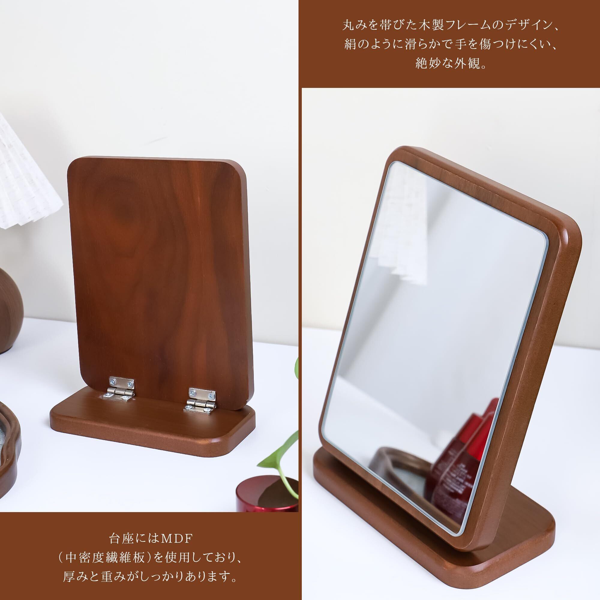 【商品仕様】商品内容:卓上メイクミラー1個。カラー:ウォールナット色。サイズ:約17.5cm x 22cm x 9cm。重量:約790g。材質:MDF(中密度繊維板)+無垢材。モニターなど環境により画像と若干見え方が違う場合がございます。
