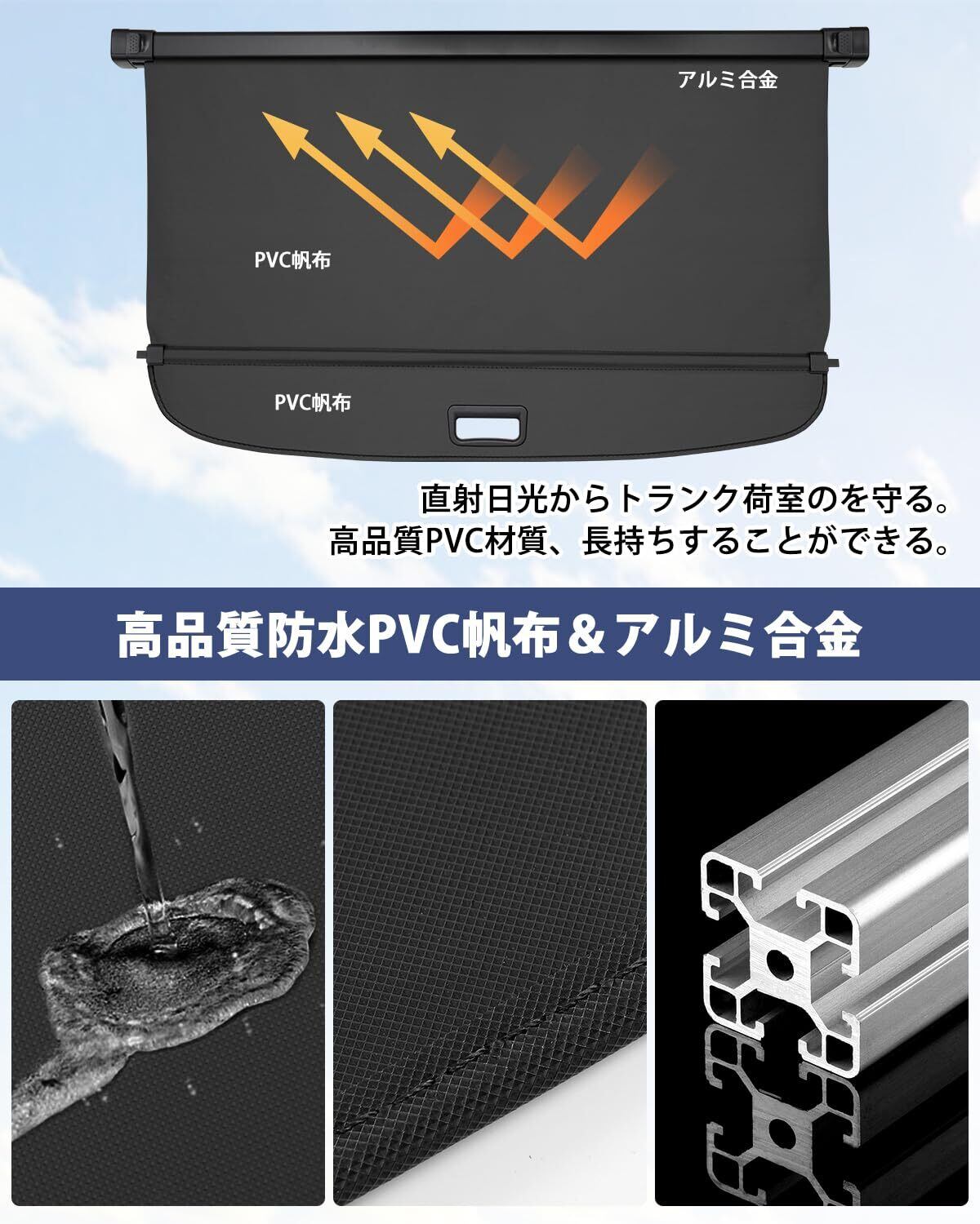 2.高品質のPVC材質とアルミ合金:耐熱性、耐摩擦、耐汚れに優れた高品質PVC材質を使用しているため、熱や直射日光から商品を守り、劣化を防ぎます。また、耐久性にも優れていて、長持ちすることができます。表面が防撥水加工されているので、水をこぼれても心配ありません。