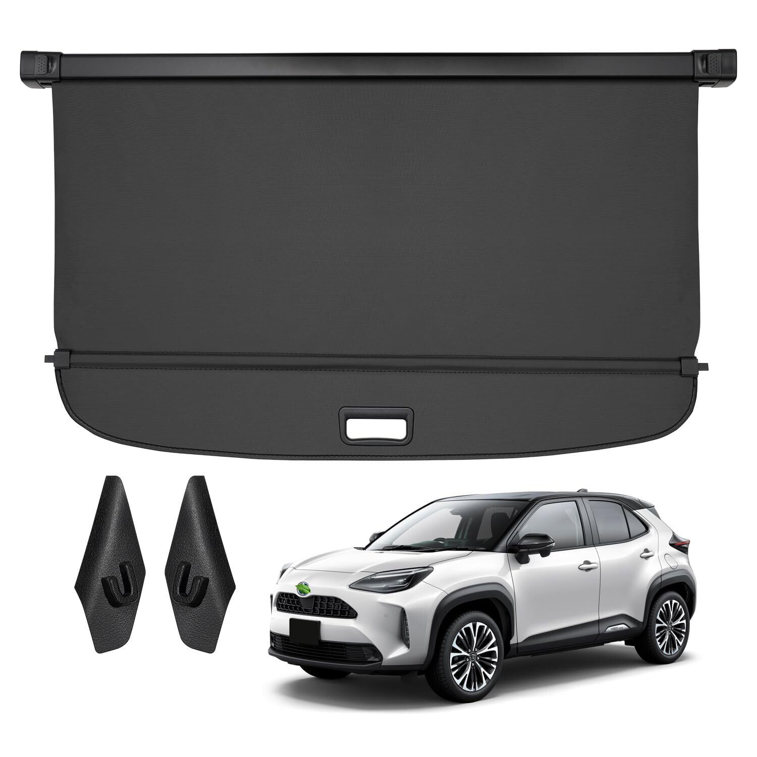 1.適合車種:新型 ヤリスクロス。型式:Yaris Cross 10系。2020年8月~現行。ご注意:取り付け場所の幅が110cmに適用。【セット内容】:トノカバー×1PCS、フック×2PCS、取付補助用の白いシート×2PCS。※本製品は特許権を有しておりますので、類似・模倣のことをご遠慮ください!