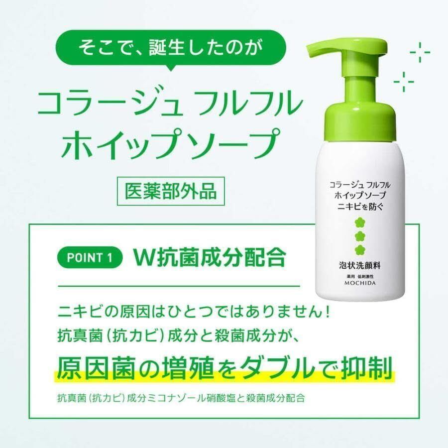 ??コラージュフルフルホイップソープ4つの特長 ??W抗菌成分配合 ??ふわふわ泡で摩擦から守ってもらう ??うるおい成分配合 ??ニキビ肌を考えたこだわり処方