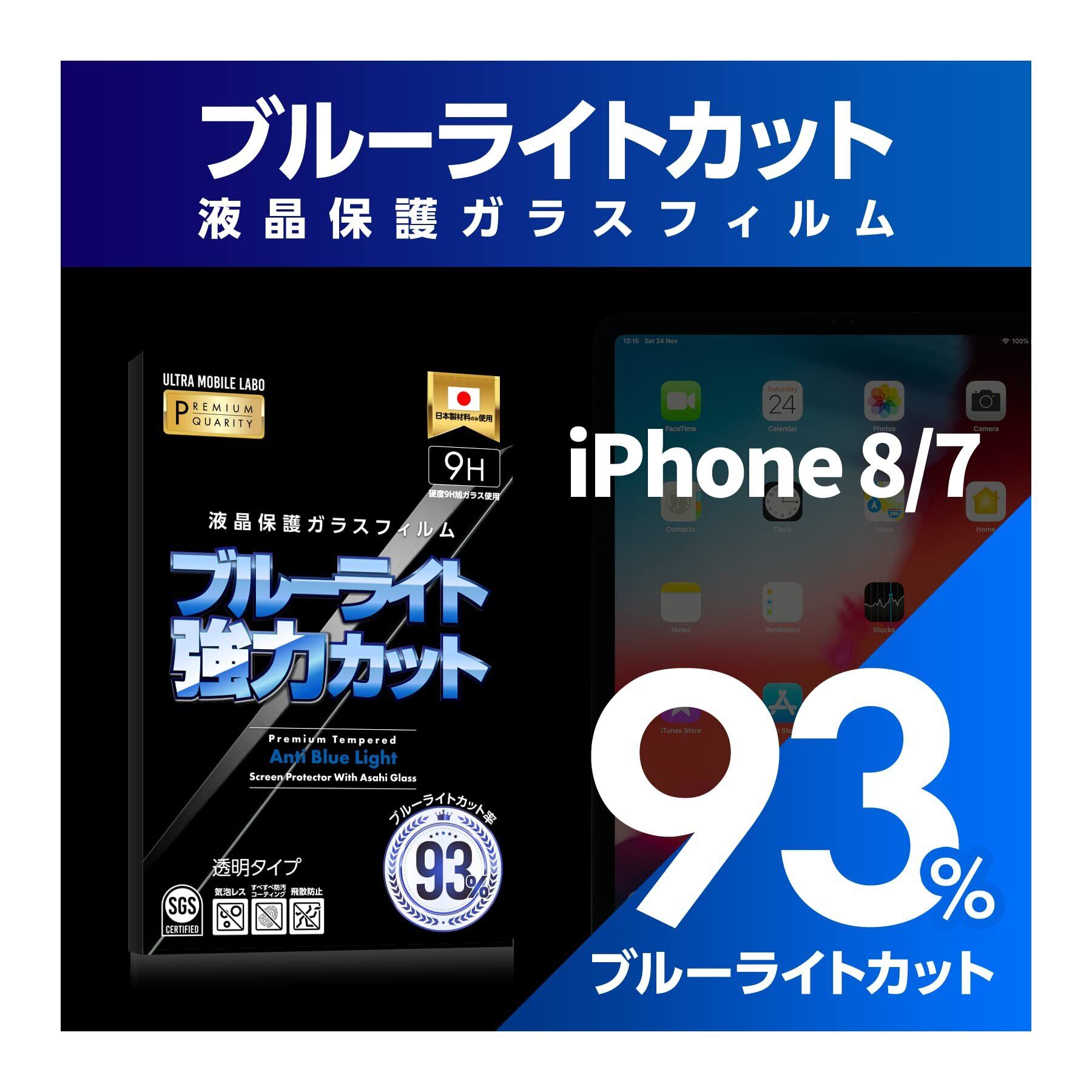 【ブルーライト93%カット】iPhone7/8用 【旭ガラス使用】ガラスフィルム【0.3mm】【2.5D】 3D touch対応 液晶保護 ラウンドエッジ加工 表面硬度9H 超耐久 超薄型 飛散防止処理 保護フィルム アイフォン用【ULTRA MOBILE LABO】