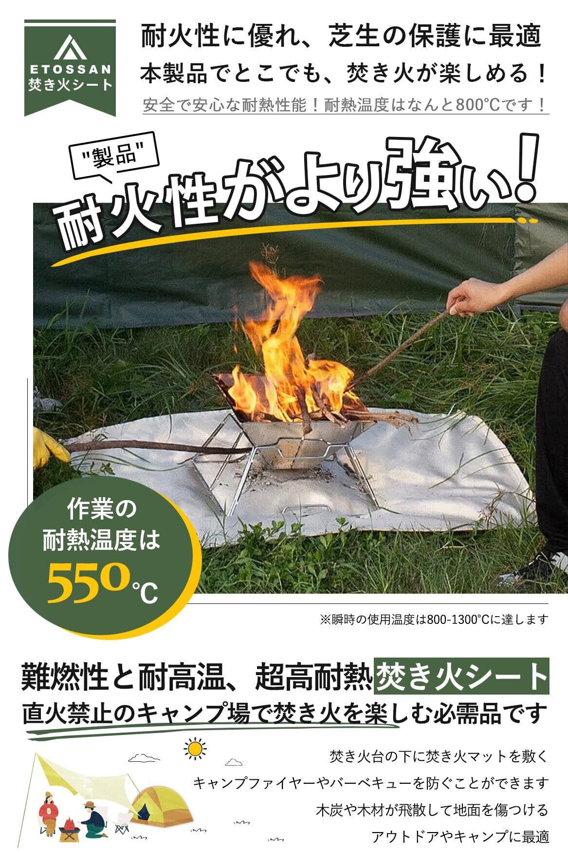 【より耐火性】耐熱シートには直径がより細い8μmのガラス繊維が使用され、耐熱温度は550℃に達し、通常の焚き火シートよりも難燃性や空気密度が高く、瞬時の使用温度は800-1300℃に達します。焚き火シートを使用すると、地面が火花で短時間加熱されるのを防ぎ、火災の拡大を防ぐことができます。また、焚き火シートは軽量で折りたたみ可能なため、持ち運びが便利です。1-3人のキャンプに適しています