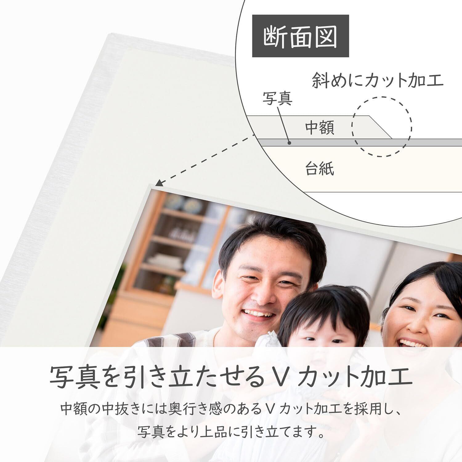 中額の中抜きには奥行き感のあるVカット加工を採用し、写真をより上品に引き立たせます。