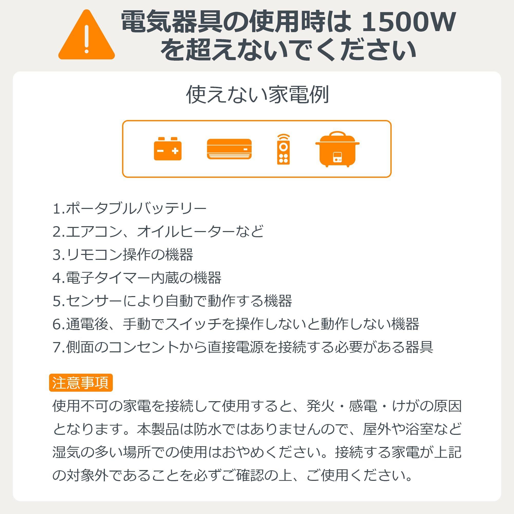 「安全性・幅広い互換性」:電気製品を長時間無人管理すると安全上の問題が生じる可能性があります。プログラムタイマーを設定すれば、特定の時間に自動的に電源を切ることで、火災や停電のリスクを軽減できます。このタイマー 電源は1500W対応のAC差込口を1つ搭載しており、家庭内の幅広い家電製品に対応可能です。例えば、室内照明器具、コーヒーメーカー、扇風機などに使用できます。