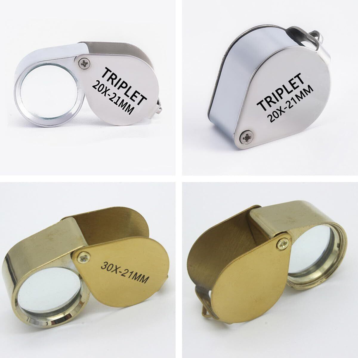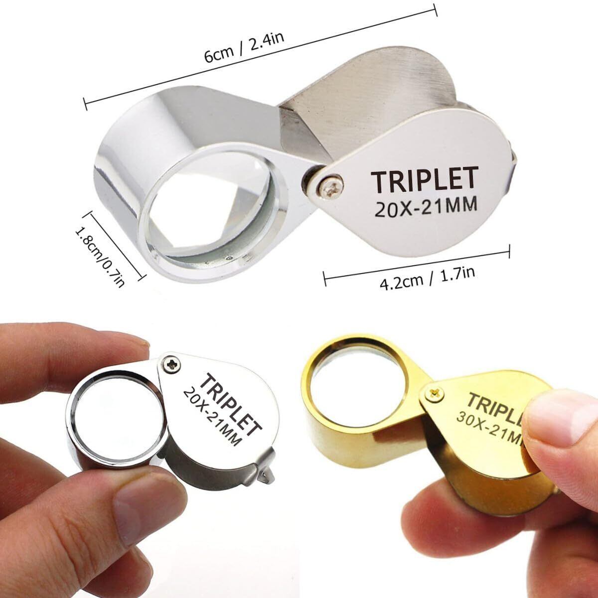 【折り畳み可能設計】? その折り畳み寸法は1.7 x 1 x 0.7インチ(4.2 x 2.5 x 1.8 cm)、展開寸法は2.4 x 1 x 0.7 in(6 x 2.5 x 1.8 cm)である。シルバールーペは20倍、ゴールドルーペは30倍です。