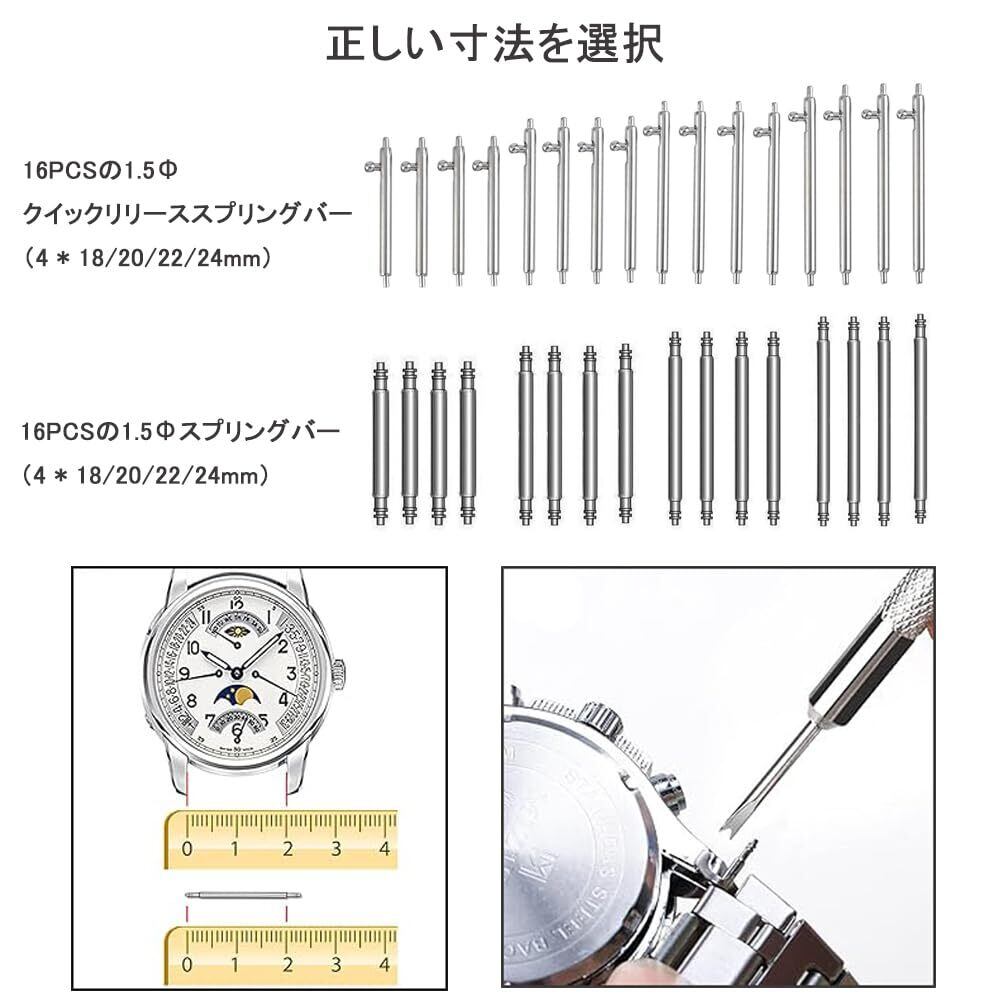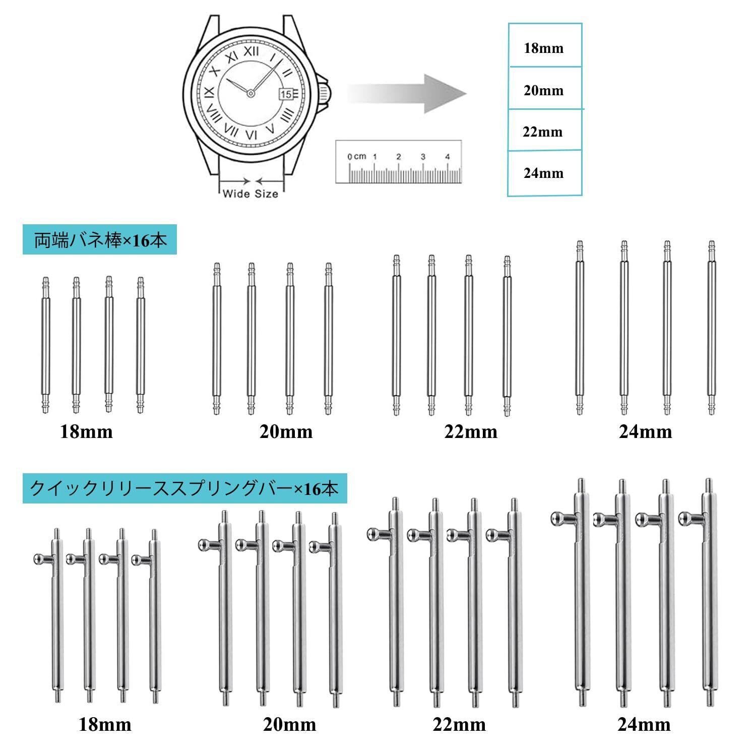 2. 時計工具セット内容:ハンマー 1本、時計 ベルト固定台座 1個、コマはずし 1個 (スペアピン3本) 、バネ棒はずし 1本、パンチ針 1本(装備スペアニードル 10本)、1枚、バネ棒 直径 φ1.5mm 16本(4pcs * 18/20/22/24mm)、クイックリリーススプリングバー 直径 φ1.5mm 16本(4pcs * 18/20/22/24mm)