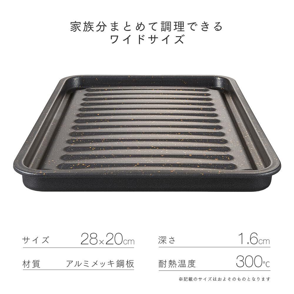 【商品仕様】商品サイズ/(約)28×20×1.6cm、材質・成分/アルミメッキ鋼板、表面加工/内面:ふっ素樹脂塗膜加工・外面:シリコン樹脂加工、耐熱温度/300℃