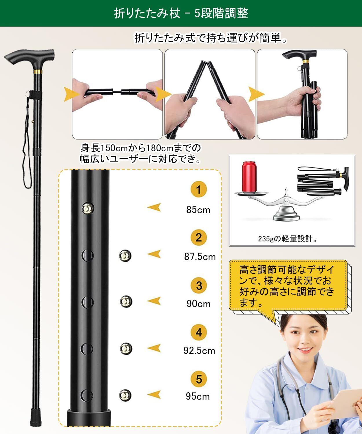 BTtime 折りたたみ杖 【理学療法士&医師&看護師監修】 折りたたみ ホルダー 伸縮式杖 歩行支援 アルミニウム製 5段階調整 超軽量 携帯に便利 男女兼用 登山用 介護用 【検査機関の強度試験に合格】85-95cm