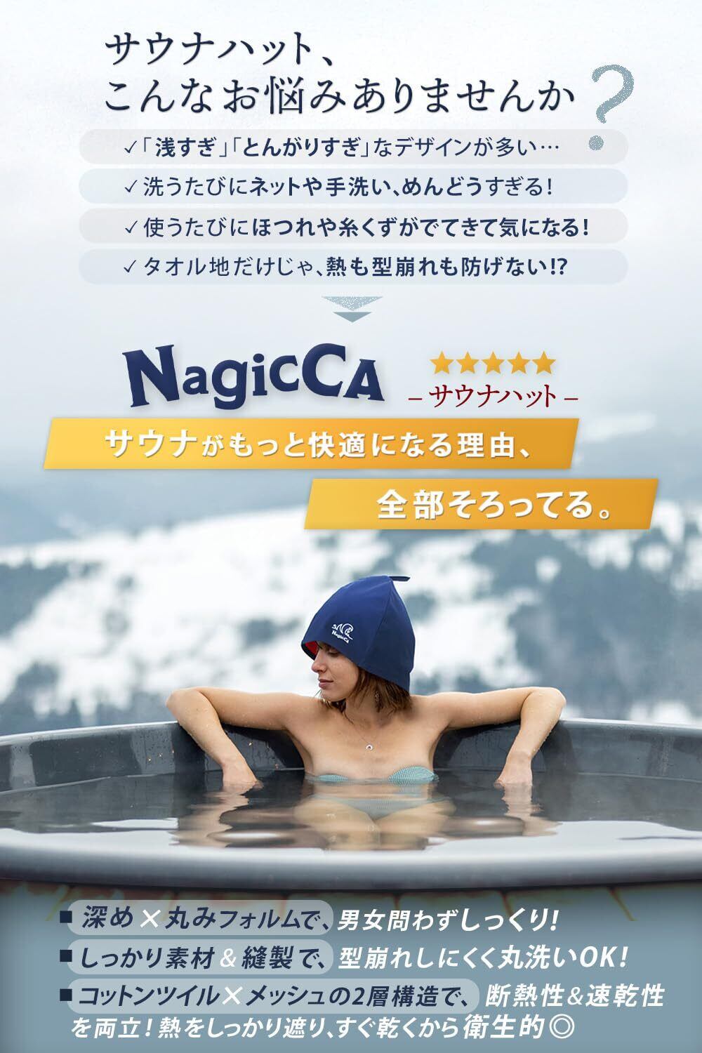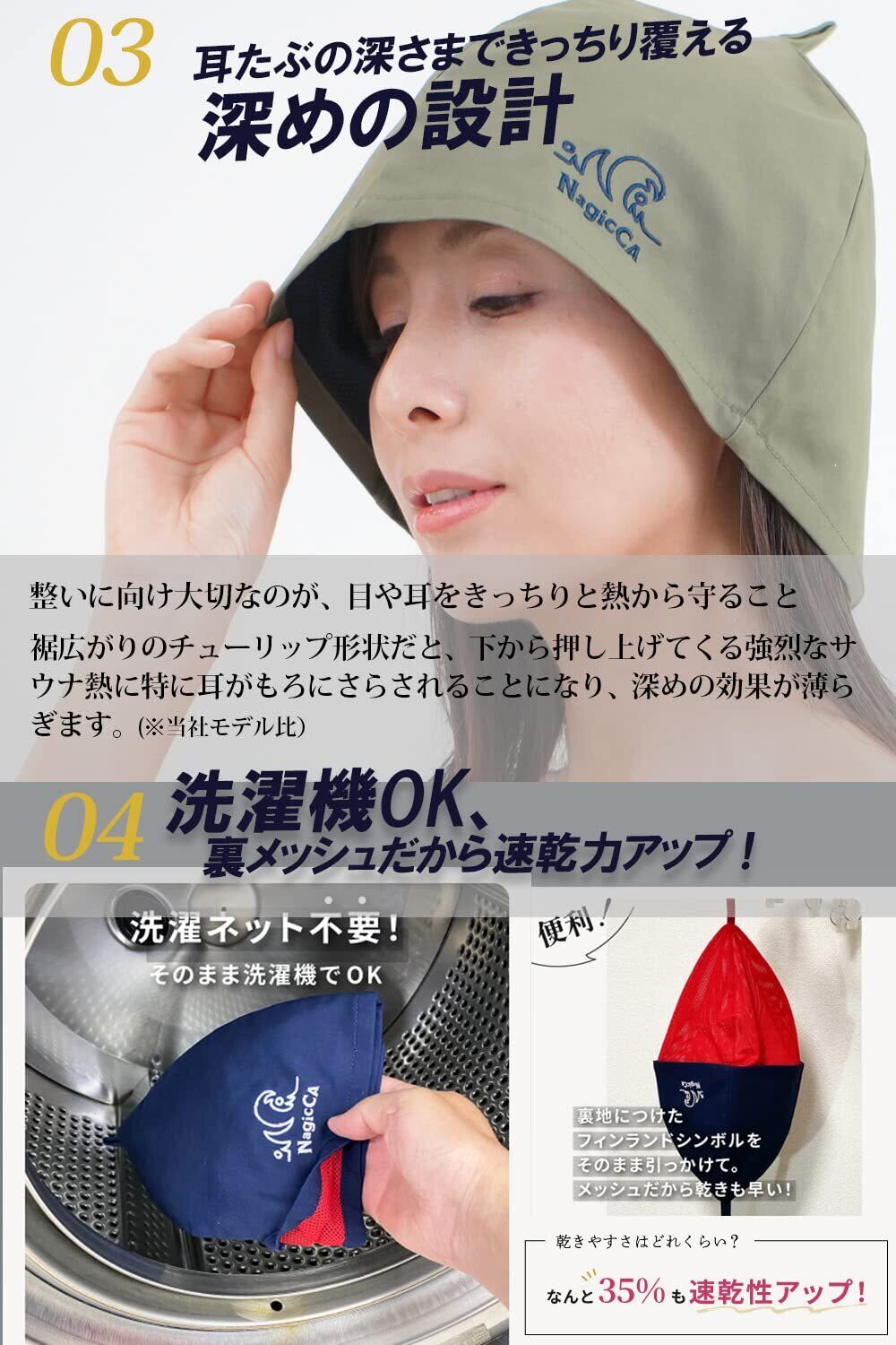 【Nagiccaサウナハットの特長と7つのこだわり】 ①業界初、高級ブランドのアウターコート素材としても知られる「コットンツイル生地」を採用!コットンツイルはきめ細かな織と美しい光沢、そしてハットにも大切な丈夫さを兼ね備えた魅力的な素材 ②メッシュ裏地との2重構造により、ハットが濡れても押さえつけずに頭皮もふんわり快適! ③吹き上げるロウリュ熱からも目元、耳たぶをきっちり守る深めのデザイン