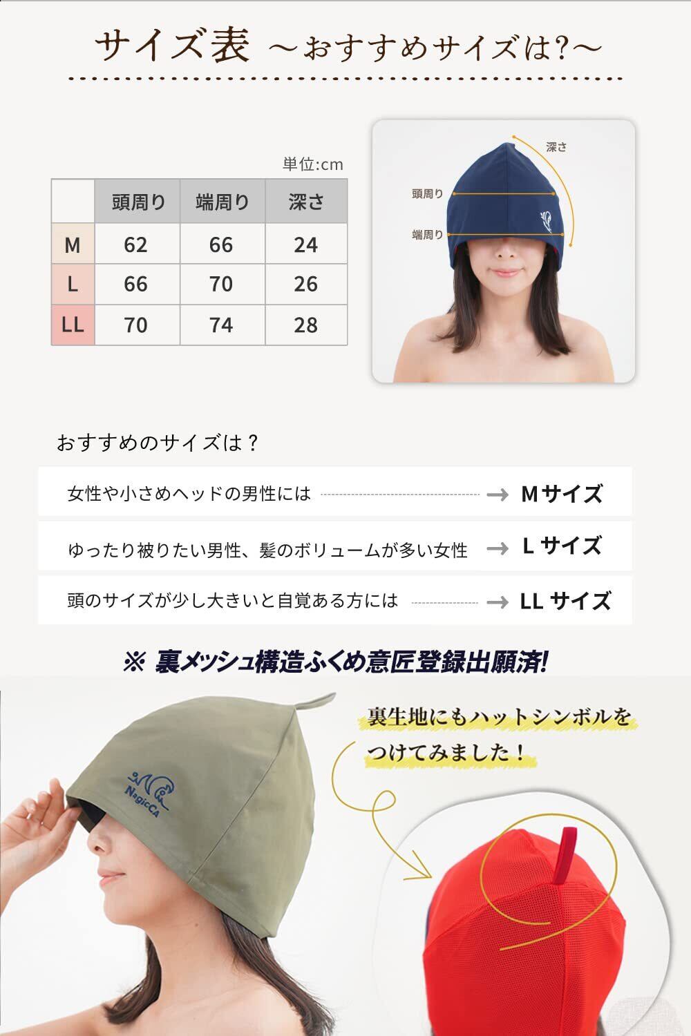【素材】表地 コットンツイル 100% (裏地ポリエステル100%) 【選べる3サイズ(約㎝)】 ★Mサイズ 頭囲62 深さ24 ★Lサイズ 頭囲66 深さ26 ★LLサイズ 頭囲70 深さ28 【効能】 髪、頭皮のダメージケア、乾燥予防、のぼせ防止に