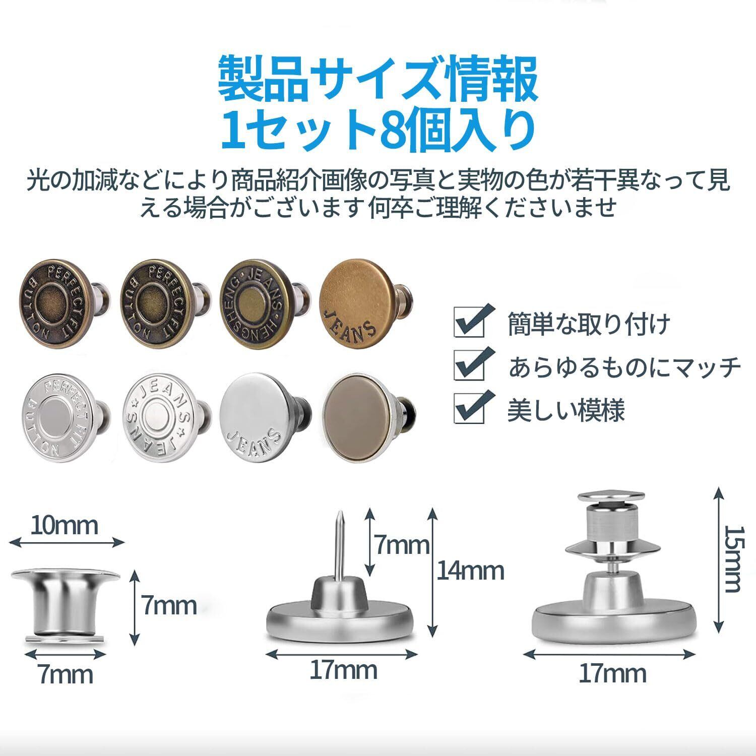 ??【工具不要、縫いなし、交換簡単】工具不要、縫製不要、取り付けがとても簡単なので、誰でも使用できます。厚手のデニム生地でも簡単に刺して取り付けられ、衣服に取り付けるのに縫製は必要なく、後ろカバーを引っ張ると自由に取り外しできます。繰り返し使用することができますので、ジーンズのボタンピンを外したいときに、工具不要で簡単に外せ、新しい洋服に再利用できます。