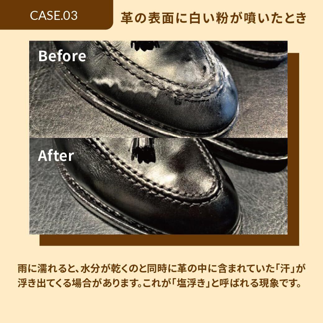 こんな時にご使用ください 1.雨でシミができてしまった時や革靴の表面に白い粉(塩分)が吹き出てきた時。 【効果】雨ジミや表面の塩分をきれいに落します。 2.長期間履いていて汗がしみ込んでいる靴や清潔感がなくなってきた時。 【効果】皮革の内側に滞留した汗を取り除き清潔性を向上させます。 3.革靴の履きシワが深くなってきた時や型崩れがひどい時。 【効果】皮革が柔軟した時にキーパーを使用することでシワや型崩れを直します。