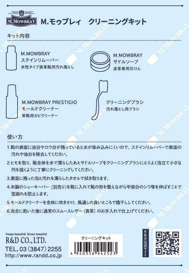 ■セット内容: ・M.モゥブレィ サドルドープ(皮革製品用石けん) ・クリーニングブラシ(ソープ・シャンプー用ブラシ) ・M.モゥブレィ ミニモールドクリーナー(革靴用カビクリーナー) ・M.モゥブレィ ステインリムーバー(水性タイプ靴用汚れ落としスムースレザー用)