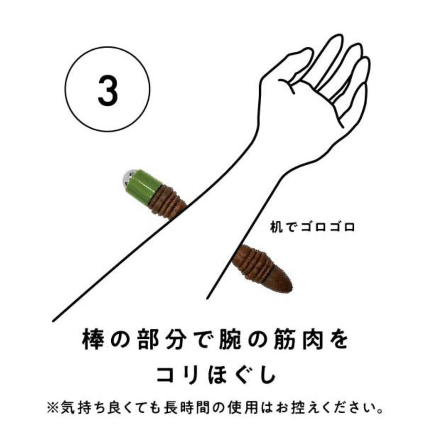 本体は木製で手触りがよく、キャップ部分はABS樹脂、コロコロ部分には鉄球を使用。それぞれの素材が役割に応じて配置されており、軽量ながらしっかりとした刺激を与えられる構造です。長く使えるセルフケアグッズとして、日常使いにぴったりです。
