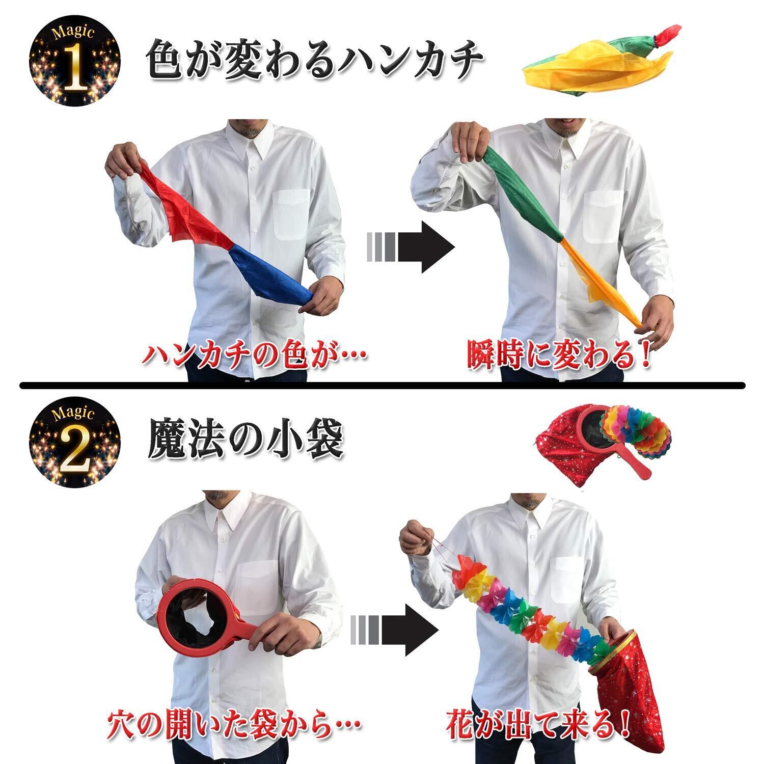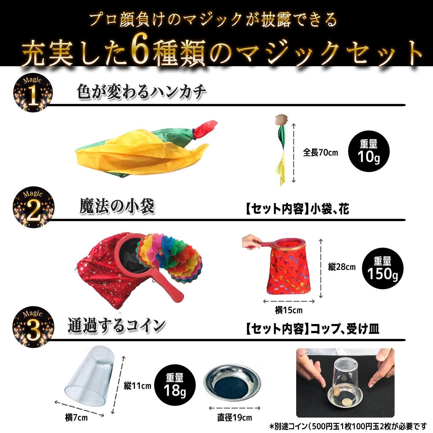 【セット内容】■花が現れる杖:全長23㎝(花の高さ19㎝、鉢の幅5㎝) 重さ20g ■色が変わるハンカチ:伸ばしきった状態で約70㎝ 重さ10g ■魔法の小袋:28㎝×15㎝ 重さ150g ■スマホを通るハンカチ:35㎝×35㎝ 重さ7.5g ■濡れない新聞紙(英字新聞風):54㎝×39㎝ 重さ20g ■通過するコインのお皿:直径19㎝ 重さ18g